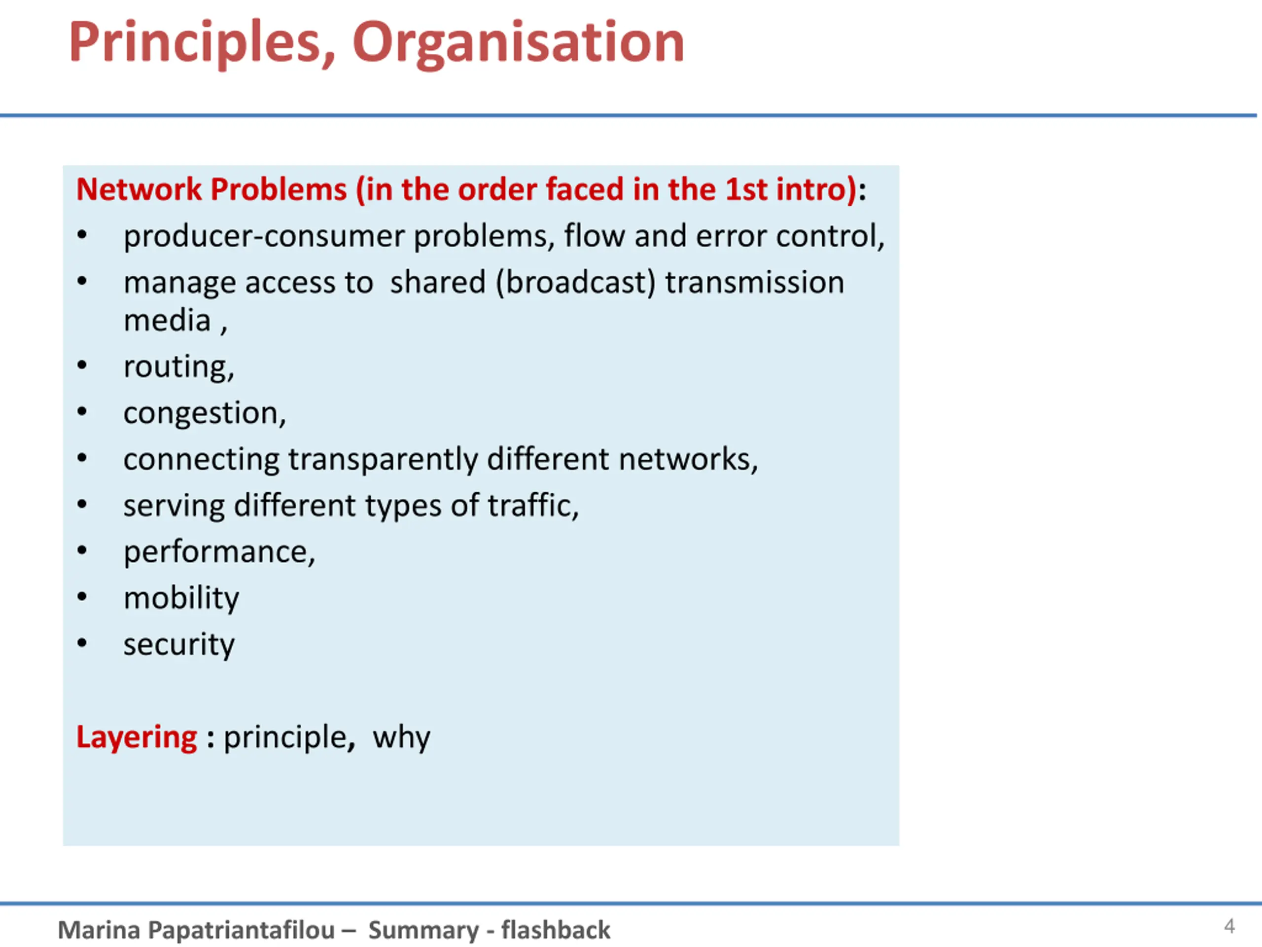 Principles, Organisation Network Problems (in the order faced in the 1st intro): producer-consumer problems, flow and error control, manage access to shared (broadcast) transmission media , routing, congestion, connecting transparently different networks, serving different types of traffic, performance, mobility security Layering : principle, why 4 Marina Papatriantafilou Summary - flashback