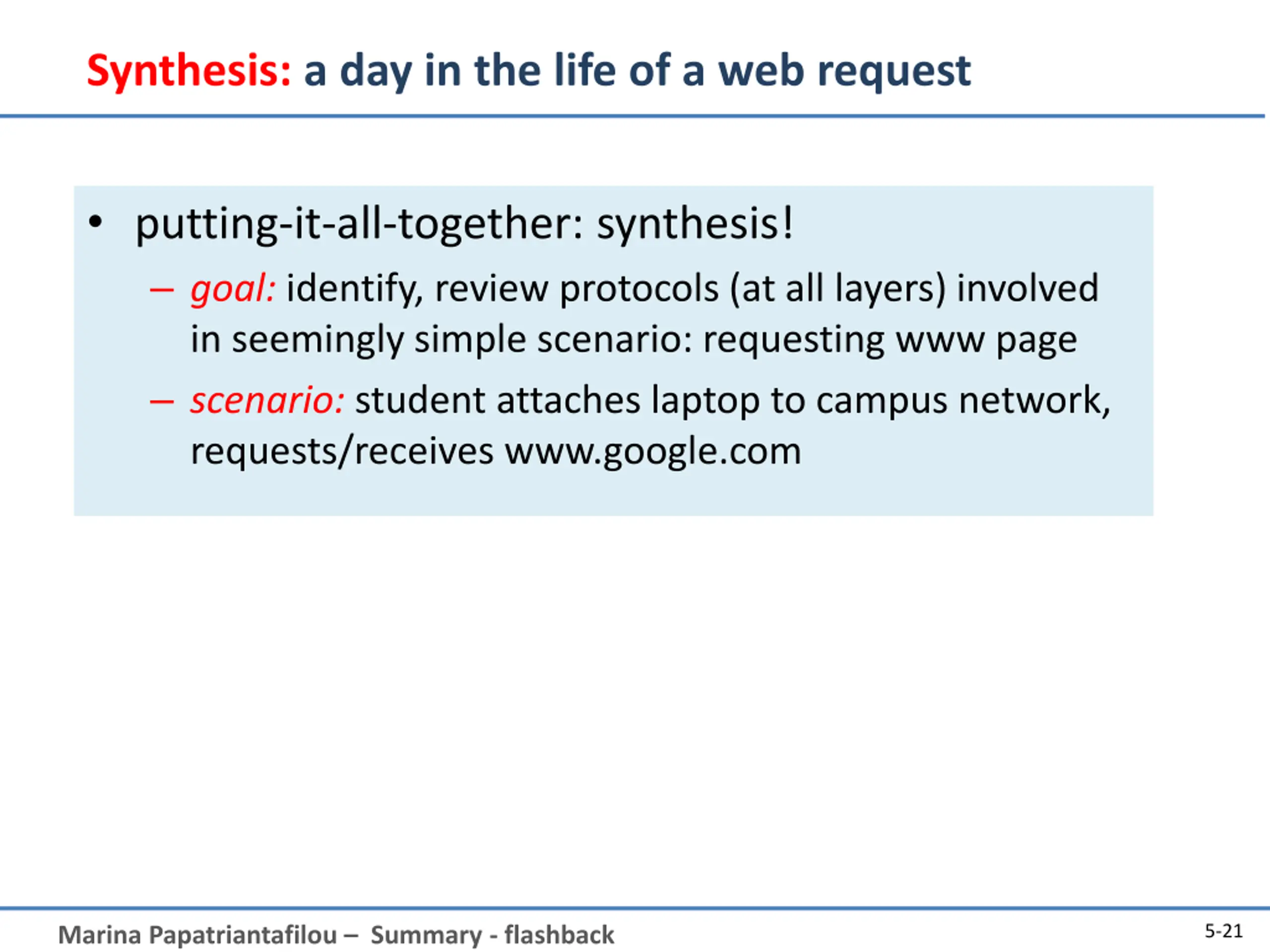 Synthesis: a day in the life of a web request putting-it-all-together: synthesis! goal: identify, review protocols (at all layers) involved in seemingly simple scenario: requesting www page scenario: student attaches laptop to campus network, requests/receives www.google.com 5-21 Marina Papatriantafilou Summary - flashback