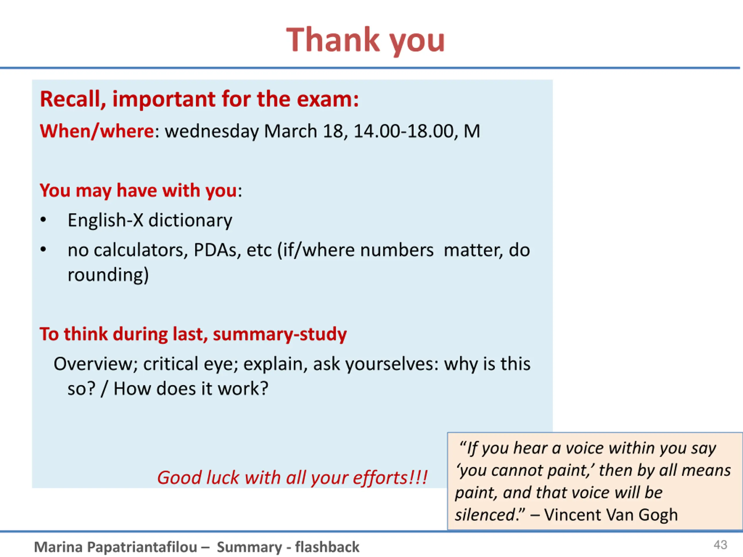 Thank you Recall, important for the exam: When/where: wednesday March 18, 14.00-18.00, M You may have with you: English-X dictionary no calculators, PDAs, etc (if/where numbers matter, do rounding) To think during last, summary-study Overview; critical eye; explain, ask yourselves: why is this so? / How does it work? If you hear a voice within you say you cannot paint, then by all means paint, and that voice will be silenced. Vincent Van Gogh Good luck with all your efforts!!! 43 Marina Papatriantafilou Summary - flashback
