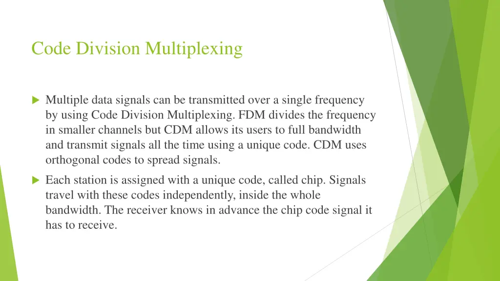 Code Division Multiplexing Multiple data signals can be transmitted over a single frequency by using Code Division Multiplexing. FDM divides the frequency in smaller channels but CDM allows its users to full bandwidth and transmit signals all the time using a unique code. CDM uses orthogonal codes to spread signals. Each station is assigned with a unique code, called chip. Signals travel with these codes independently, inside the whole bandwidth. The receiver knows in advance the chip code signal it has to receive.