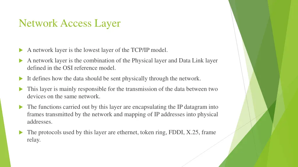 Network Access Layer A network layer is the lowest layer of the TCP/IP model. A network layer is the combination of the Physical layer and Data Link layer defined in the OSI reference model. It defines how the data should be sent physically through the network. This layer is mainly responsible for the transmission of the data between two devices on the same network. The functions carried out by this layer are encapsulating the IP datagram into frames transmitted by the network and mapping of IP addresses into physical addresses. The protocols used by this layer are ethernet, token ring, FDDI, X.25, frame relay.