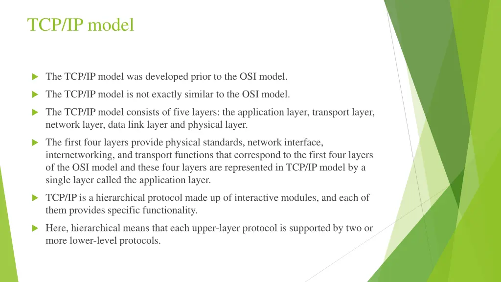 TCP/IP model The TCP/IP model was developed prior to the OSI model. The TCP/IP model is not exactly similar to the OSI model. The TCP/IP model consists of five layers: the application layer, transport layer, network layer, data link layer and physical layer. The first four layers provide physical standards, network interface, internetworking, and transport functions that correspond to the first four layers of the OSI model and these four layers are represented in TCP/IP model by a single layer called the application layer. TCP/IP is a hierarchical protocol made up of interactive modules, and each of them provides specific functionality. Here, hierarchical means that each upper-layer protocol is supported by two or more lower-level protocols.