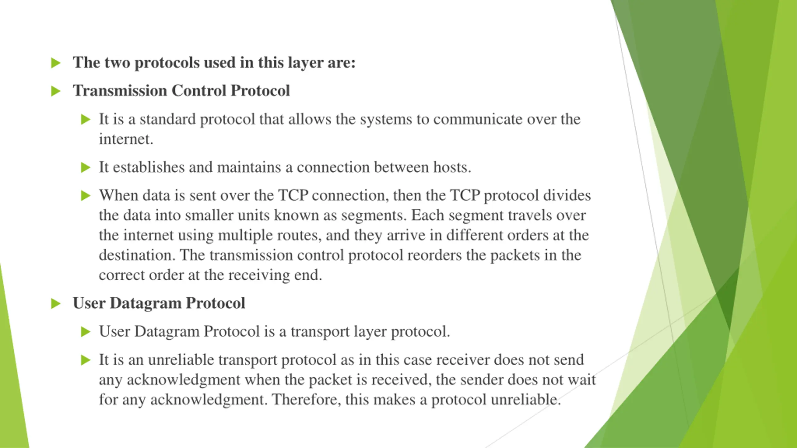The two protocols used in this layer are: Transmission Control Protocol It is a standard protocol that allows the systems to communicate over the internet. It establishes and maintains a connection between hosts. When data is sent over the TCP connection, then the TCP protocol divides the data into smaller units known as segments. Each segment travels over the internet using multiple routes, and they arrive in different orders at the destination. The transmission control protocol reorders the packets in the correct order at the receiving end. User Datagram Protocol User Datagram Protocol is a transport layer protocol. It is an unreliable transport protocol as in this case receiver does not send any acknowledgment when the packet is received, the sender does not wait for any acknowledgment. Therefore, this makes a protocol unreliable.