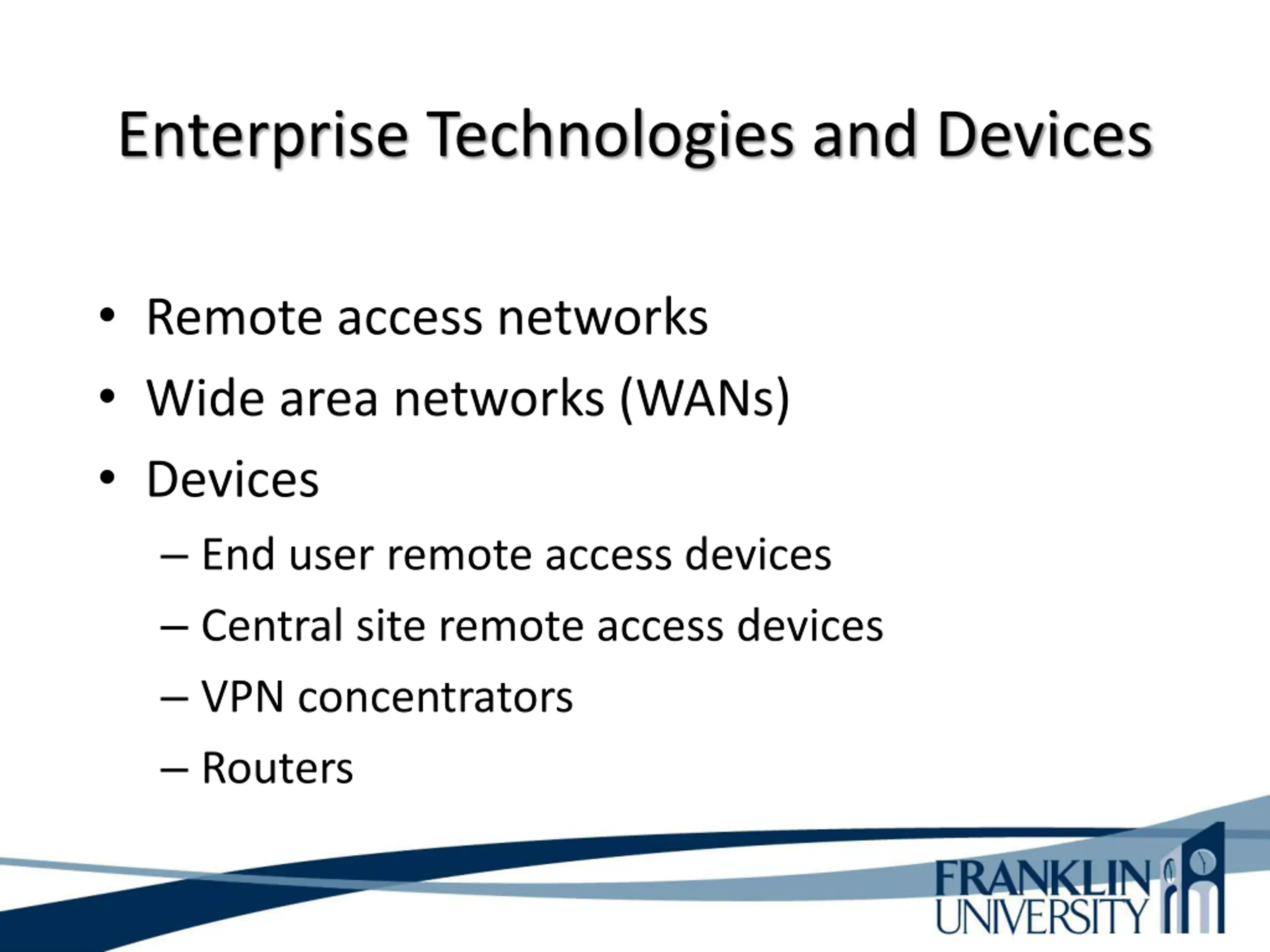 Enterprise Technologies and Devices Remote access networks Wide area networks (WANs) Devices End user remote access devices Central site remote access devices VPN concentrators Routers