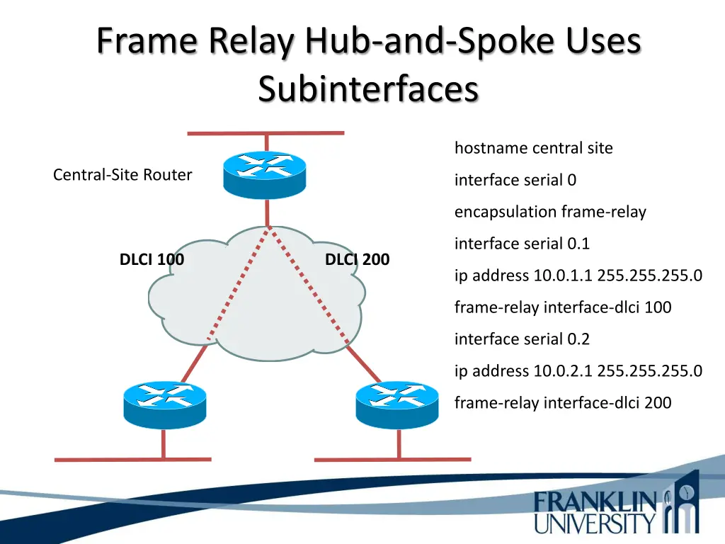 Frame Relay Hub-and-Spoke Uses Subinterfaces hostname central site Central-Site Router interface serial 0 encapsulation frame-relay interface serial 0.1 DLCI 100 DLCI 200 ip address 10.0.1.1 255.255.255.0 frame-relay interface-dlci 100 interface serial 0.2 ip address 10.0.2.1 255.255.255.0 frame-relay interface-dlci 200
