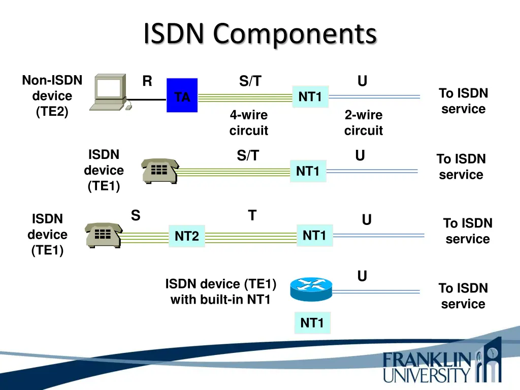 ISDN Components R S/T U Non-ISDN device (TE2) To ISDN service NT1 TA 4-wire circuit 2-wire circuit S/T U ISDN device (TE1) To ISDN service NT1 S T U ISDN device (TE1) To ISDN service NT1 NT2 U ISDN device (TE1) with built-in NT1 To ISDN service NT1