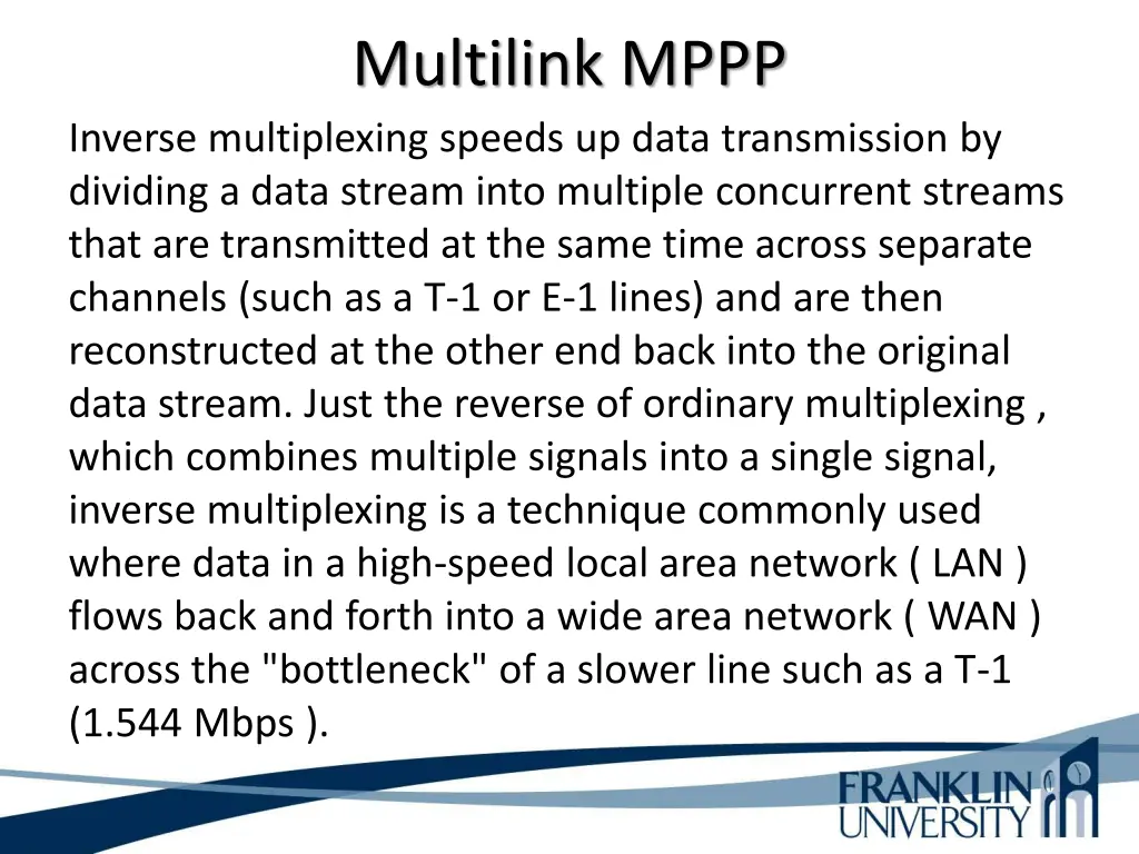 Multilink MPPP MPPP defines protocols for splitting the data stream into PPP packets, sequencing the packets, transmitting them over separate logical data links, and then recombining them at the receiving station.