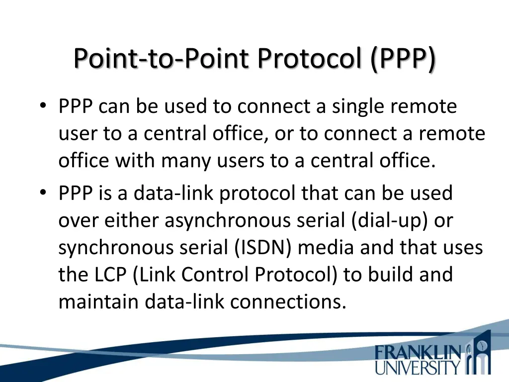 Point-to-Point Protocol (PPP) PPP can be used to connect a single remote user to a central office, or to connect a remote office with many users to a central office. PPP is a data-link protocol that can be used over either asynchronous serial (dial-up) or synchronous serial (ISDN) media and that uses the LCP (Link Control Protocol) to build and maintain data-link connections.