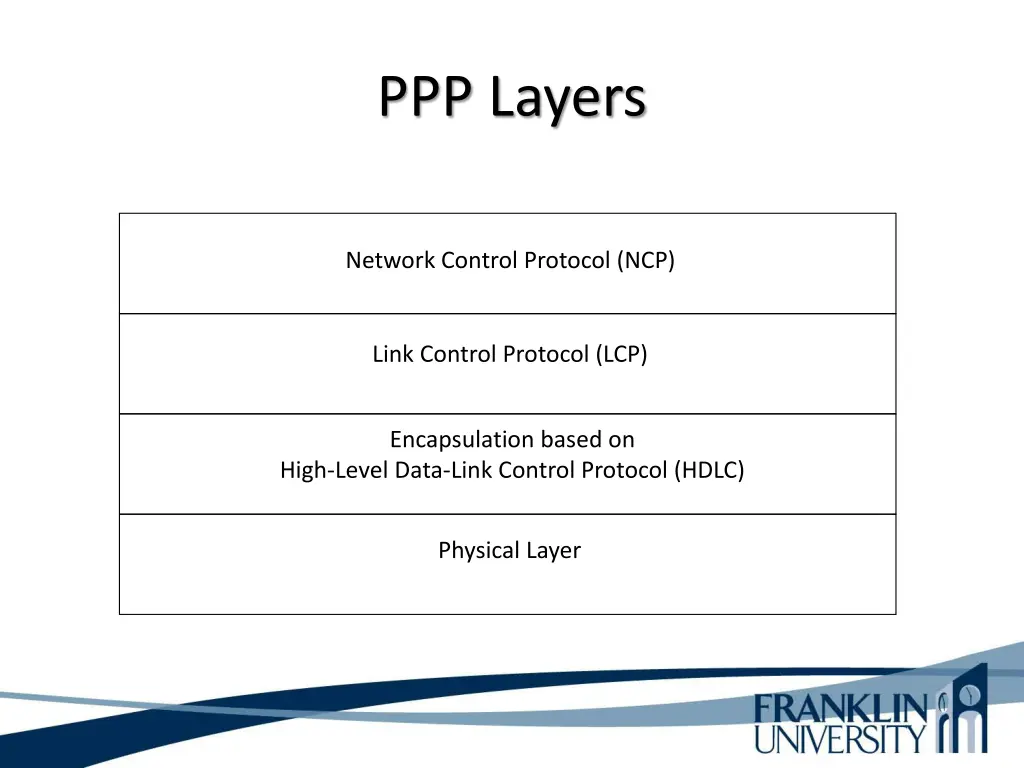 PPP Layers Network Control Protocol (NCP) Link Control Protocol (LCP) Encapsulation based on High-Level Data-Link Control Protocol (HDLC) Physical Layer