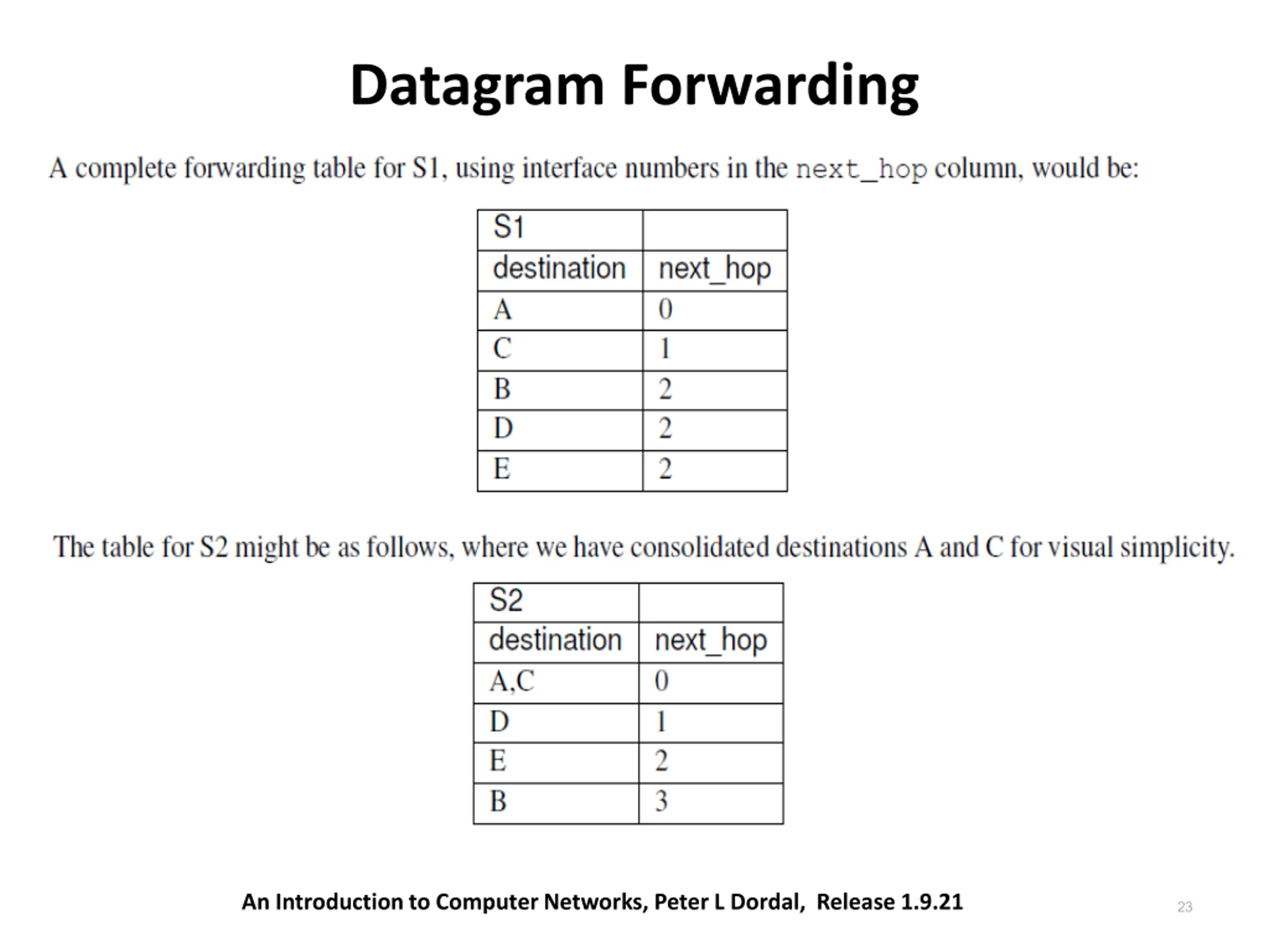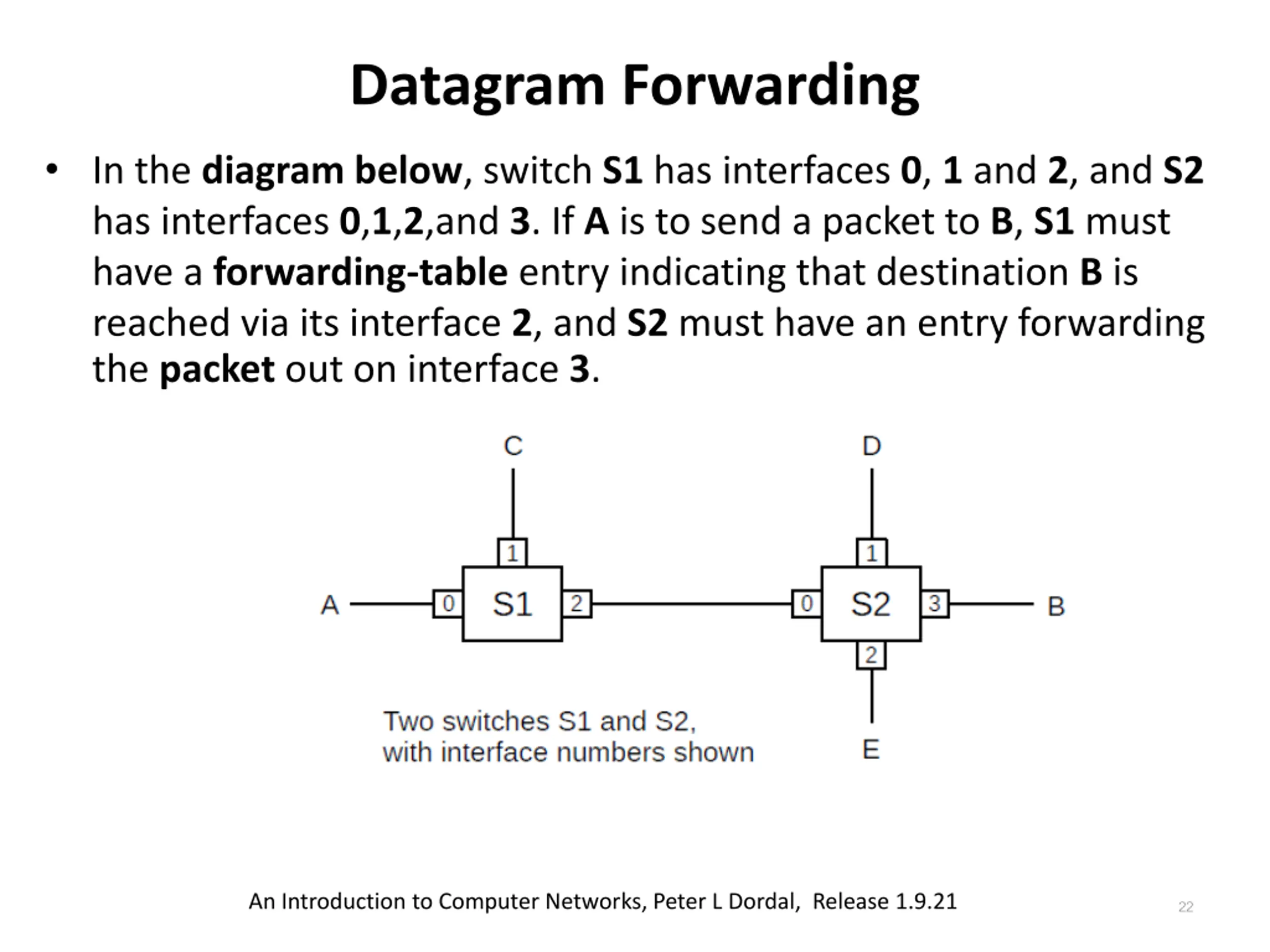 Datagram Forwarding In the diagram below, switch S1 has interfaces 0, 1 and 2, and S2 has interfaces 0,1,2,and 3. If A is to send a packet to B, S1 must have a forwarding-table entry indicating that destination B is reached via its interface 2, and S2 must have an entry forwarding the packet out on interface 3. An Introduction to Computer Networks, Peter L Dordal, Release 1.9.21 22