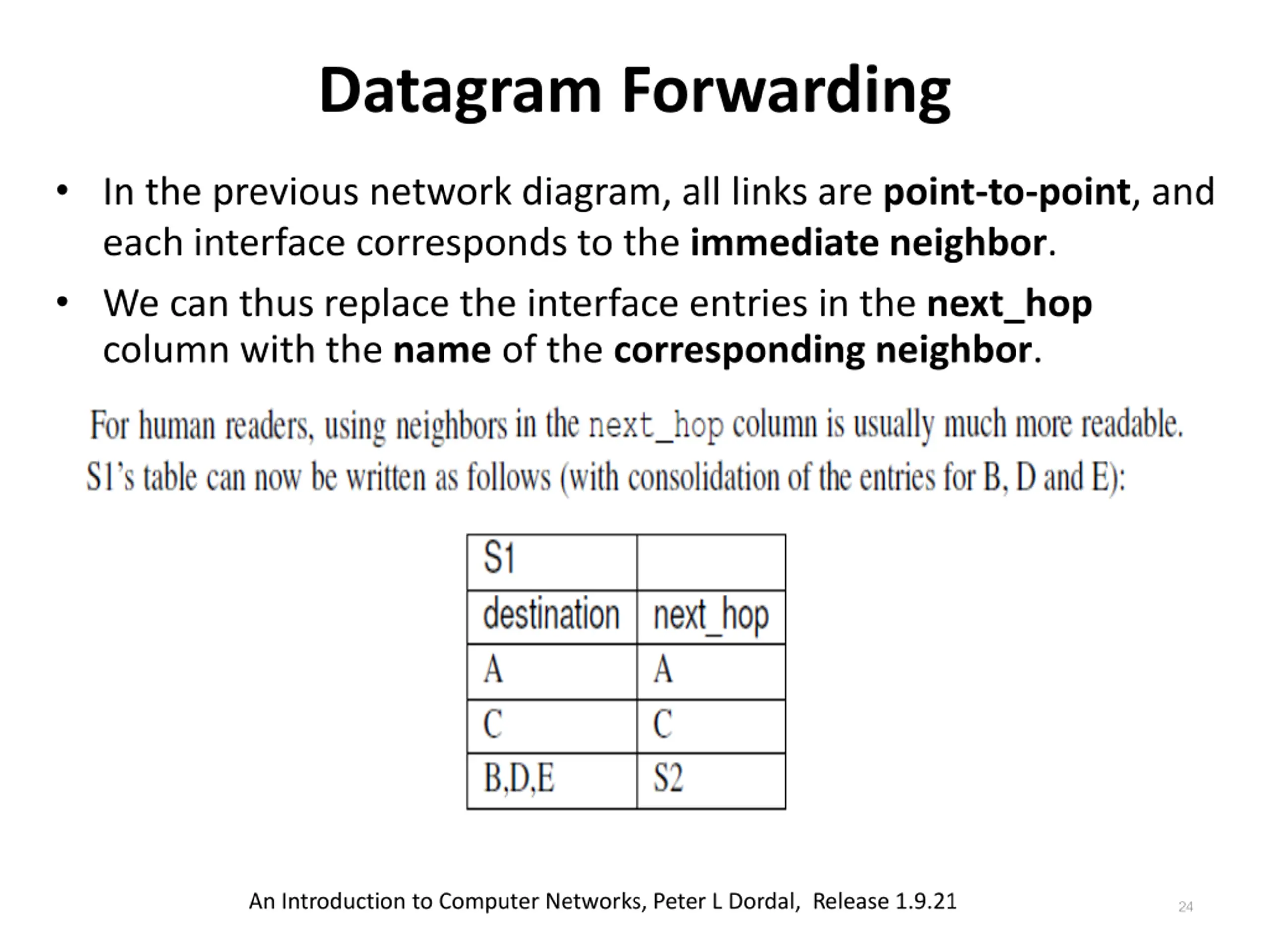 Datagram Forwarding In the previous network diagram, all links are point-to-point, and each interface corresponds to the immediate neighbor. We can thus replace the interface entries in the next_hop column with the name of the corresponding neighbor. An Introduction to Computer Networks, Peter L Dordal, Release 1.9.21 24