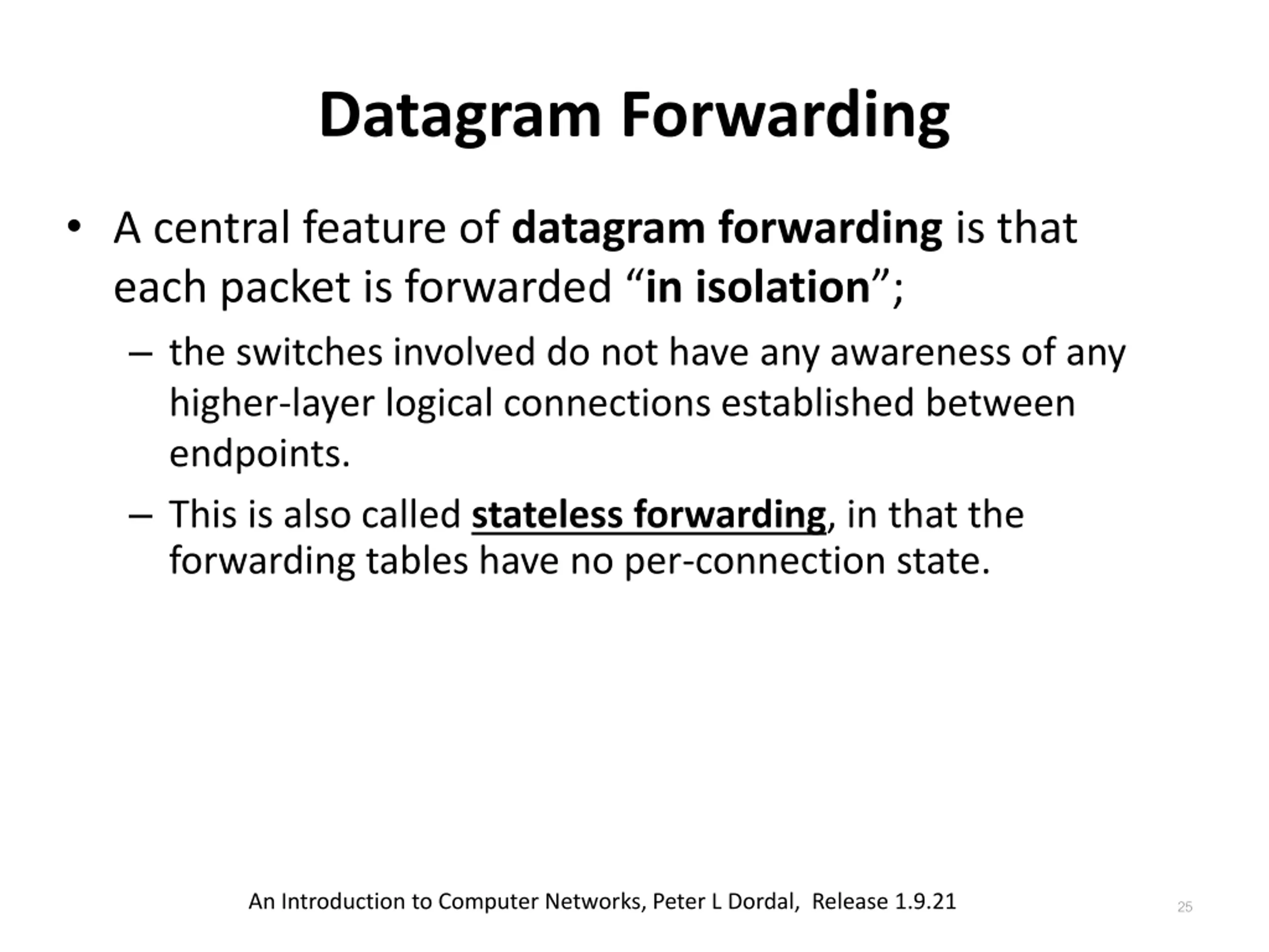 Datagram Forwarding A central feature of datagram forwarding is that each packet is forwarded in isolation ; the switches involved do not have any awareness of any higher-layer logical connections established between endpoints. This is also called stateless forwarding, in that the forwarding tables have no per-connection state. An Introduction to Computer Networks, Peter L Dordal, Release 1.9.21 25