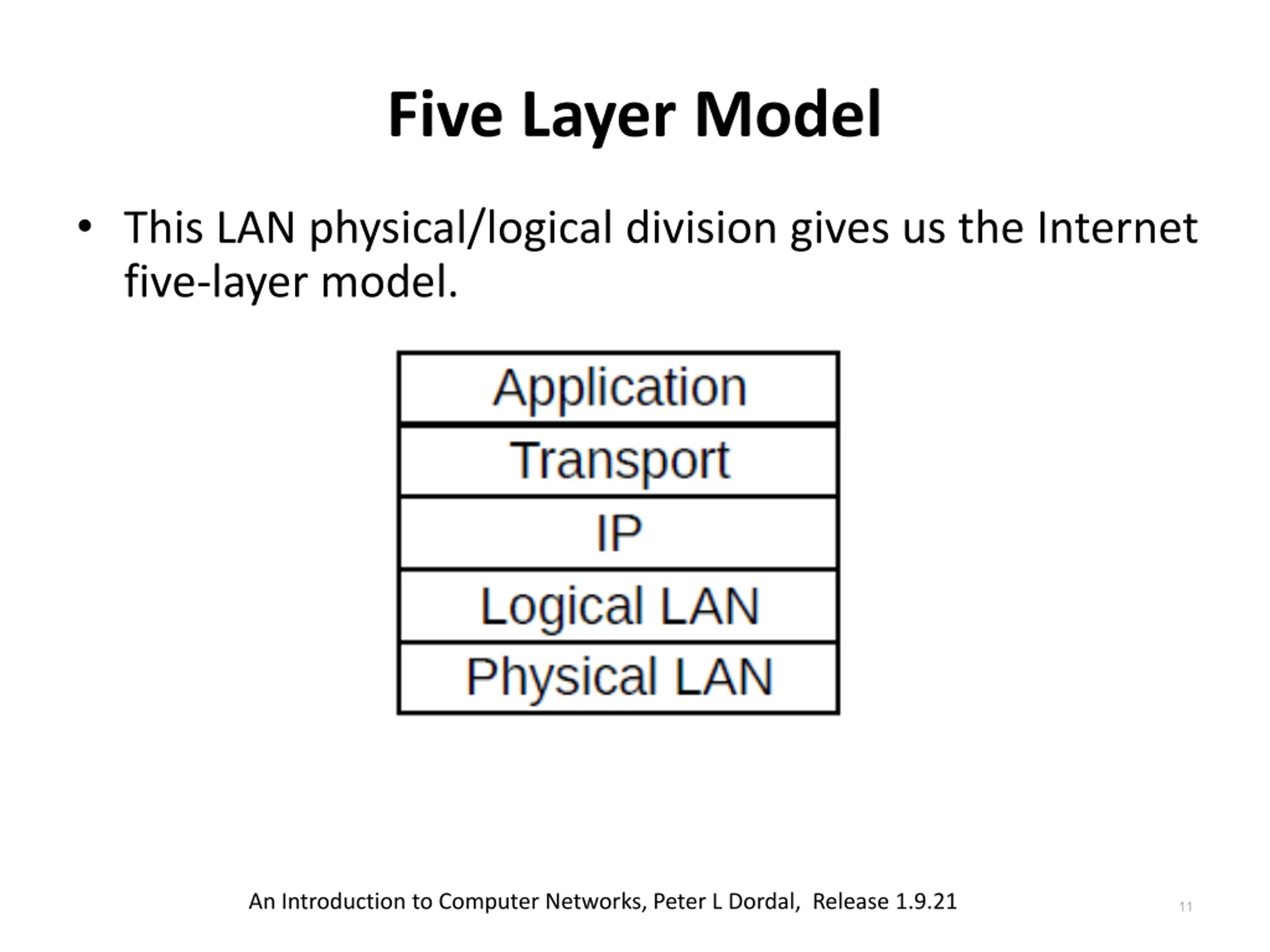 Five Layer Model This LAN physical/logical division gives us the Internet five-layer model. An Introduction to Computer Networks, Peter L Dordal, Release 1.9.21 11