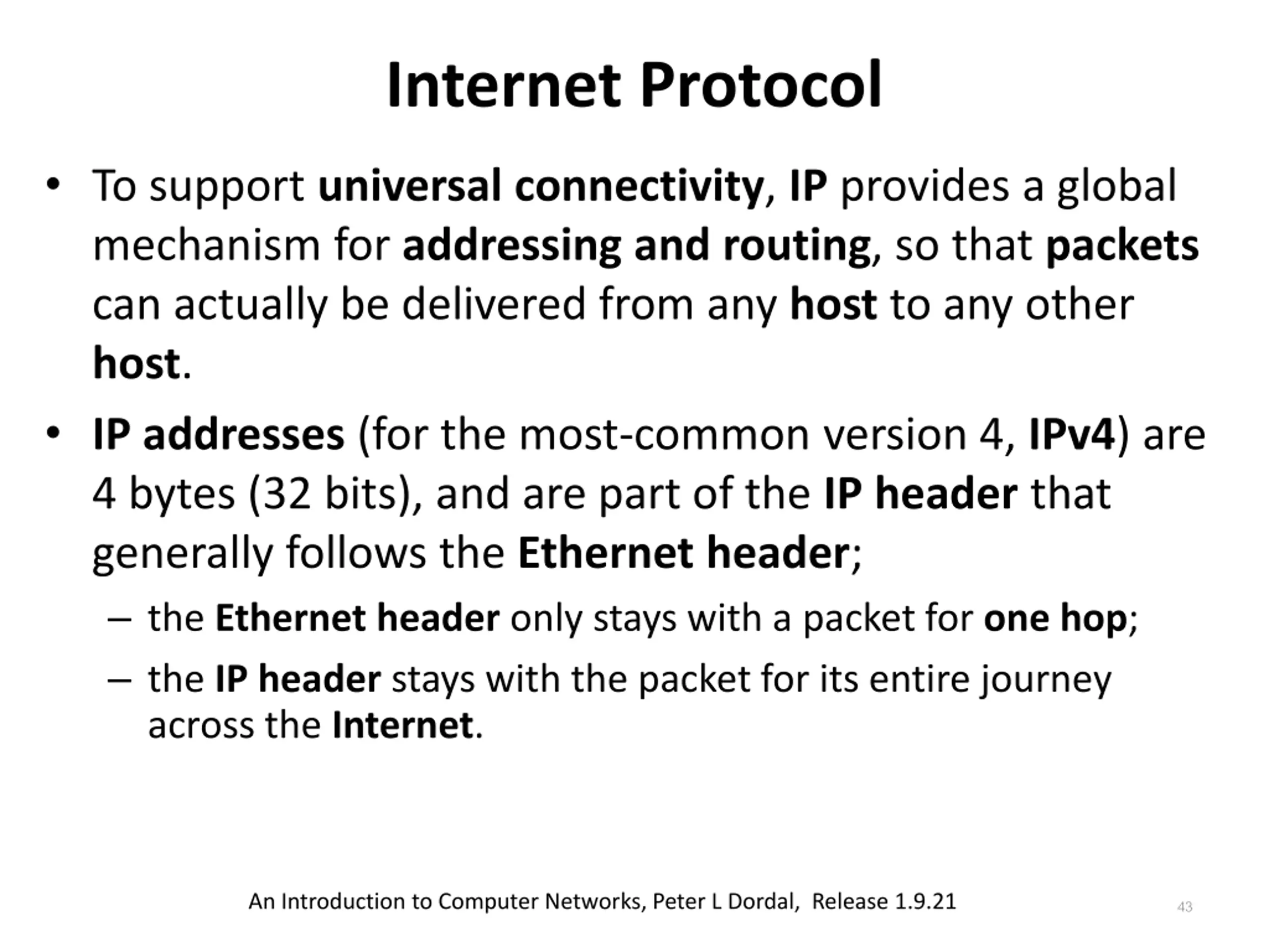 Internet Protocol To support universal connectivity, IP provides a global mechanism for addressing and routing, so that packets can actually be delivered from any host to any other host. IP addresses (for the most-common version 4, IPv4) are 4 bytes (32 bits), and are part of the IP header that generally follows the Ethernet header; the Ethernet header only stays with a packet for one hop; the IP header stays with the packet for its entire journey across the Internet. An Introduction to Computer Networks, Peter L Dordal, Release 1.9.21 43