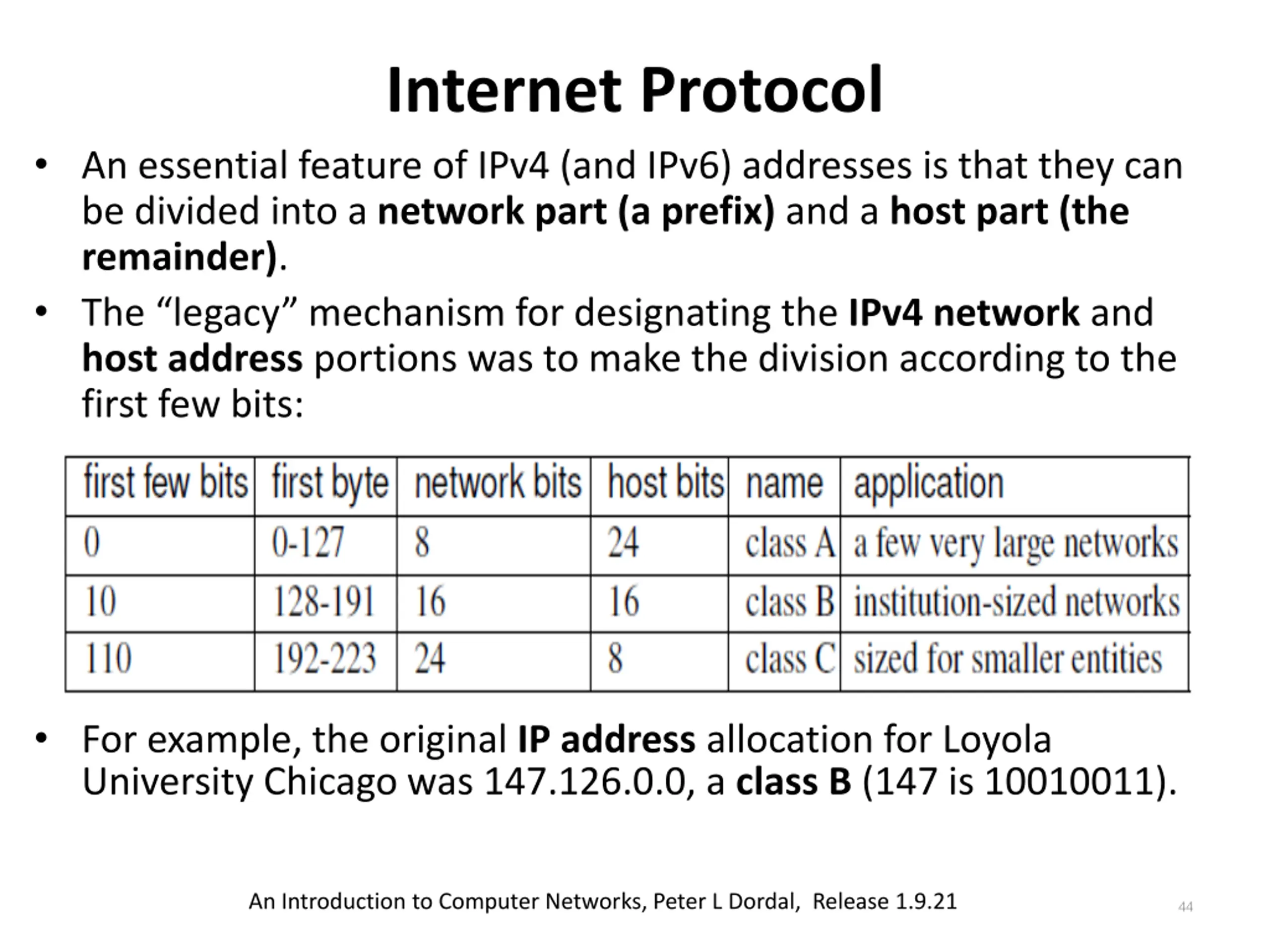 Internet Protocol An essential feature of IPv4 (and IPv6) addresses is that they can be divided into a network part (a prefix) and a host part (the remainder). The legacy mechanism for designating the IPv4 network and host address portions was to make the division according to the first few bits: For example, the original IP address allocation for Loyola University Chicago was 147.126.0.0, a class B (147 is 10010011). An Introduction to Computer Networks, Peter L Dordal, Release 1.9.21 44