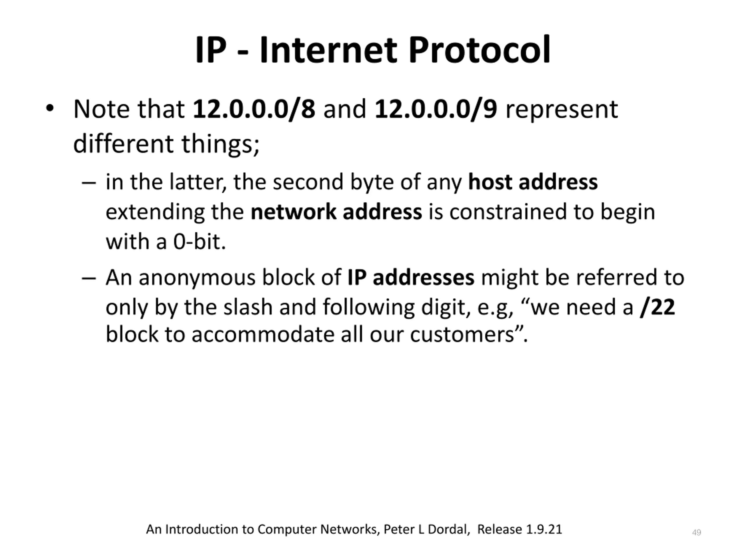 IP - Internet Protocol Note that 12.0.0.0/8 and 12.0.0.0/9 represent different things; in the latter, the second byte of any host address extending the network address is constrained to begin with a 0-bit. An anonymous block of IP addresses might be referred to only by the slash and following digit, e.g, we need a /22 block to accommodate all our customers . An Introduction to Computer Networks, Peter L Dordal, Release 1.9.21 49