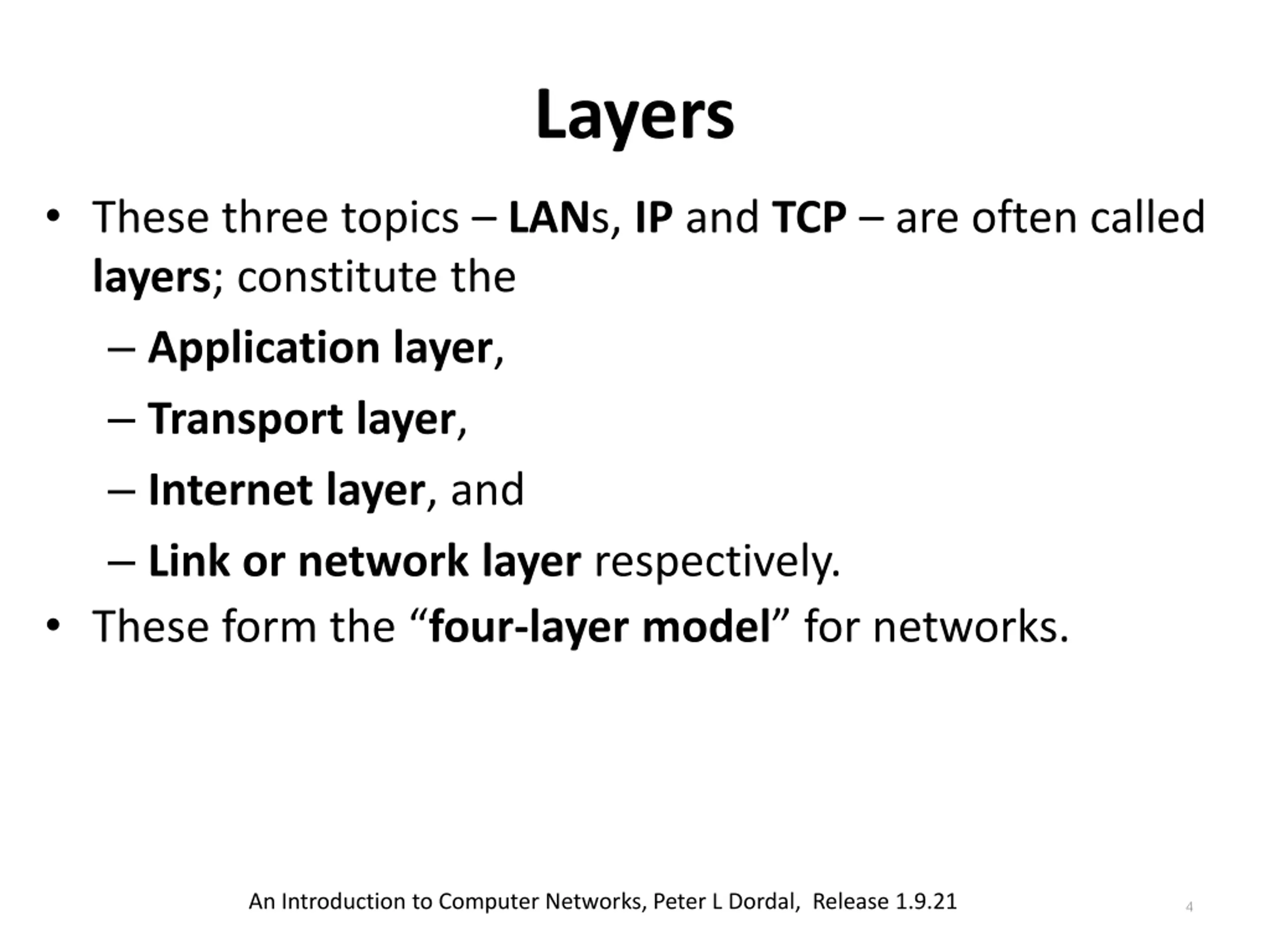 Layers These three topics LANs, IP and TCP are often called layers; constitute the Application layer, Transport layer, Internet layer, and Link or network layer respectively. These form the four-layer model for networks. An Introduction to Computer Networks, Peter L Dordal, Release 1.9.21 4