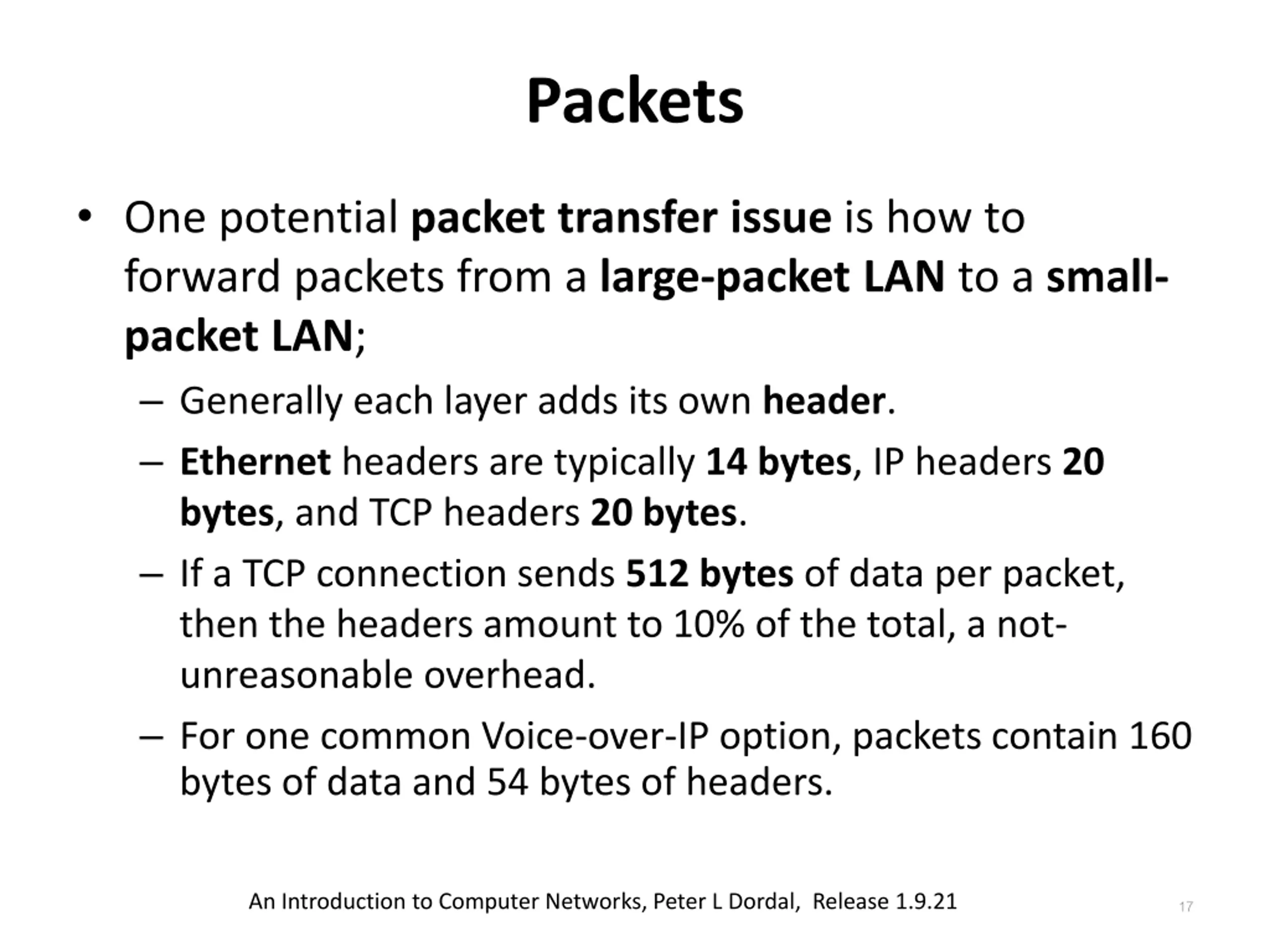 Packets One potential packet transfer issue is how to forward packets from a large-packet LAN to a small- packet LAN; Generally each layer adds its own header. Ethernet headers are typically 14 bytes, IP headers 20 bytes, and TCP headers 20 bytes. If a TCP connection sends 512 bytes of data per packet, then the headers amount to 10% of the total, a not- unreasonable overhead. For one common Voice-over-IP option, packets contain 160 bytes of data and 54 bytes of headers. An Introduction to Computer Networks, Peter L Dordal, Release 1.9.21 17