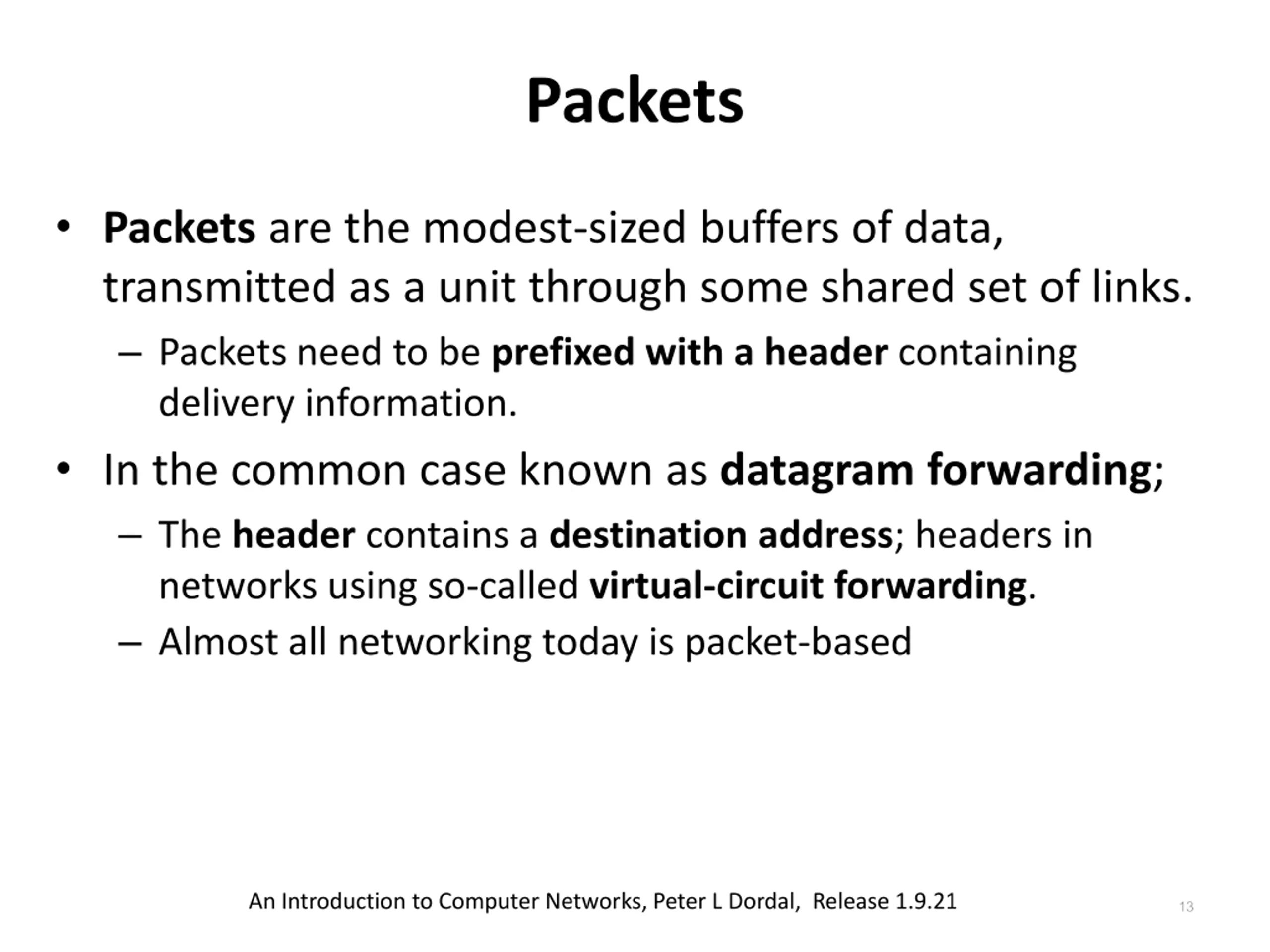 Packets Packets are the modest-sized buffers of data, transmitted as a unit through some shared set of links. Packets need to be prefixed with a header containing delivery information. In the common case known as datagram forwarding; The header contains a destination address; headers in networks using so-called virtual-circuit forwarding. Almost all networking today is packet-based An Introduction to Computer Networks, Peter L Dordal, Release 1.9.21 13