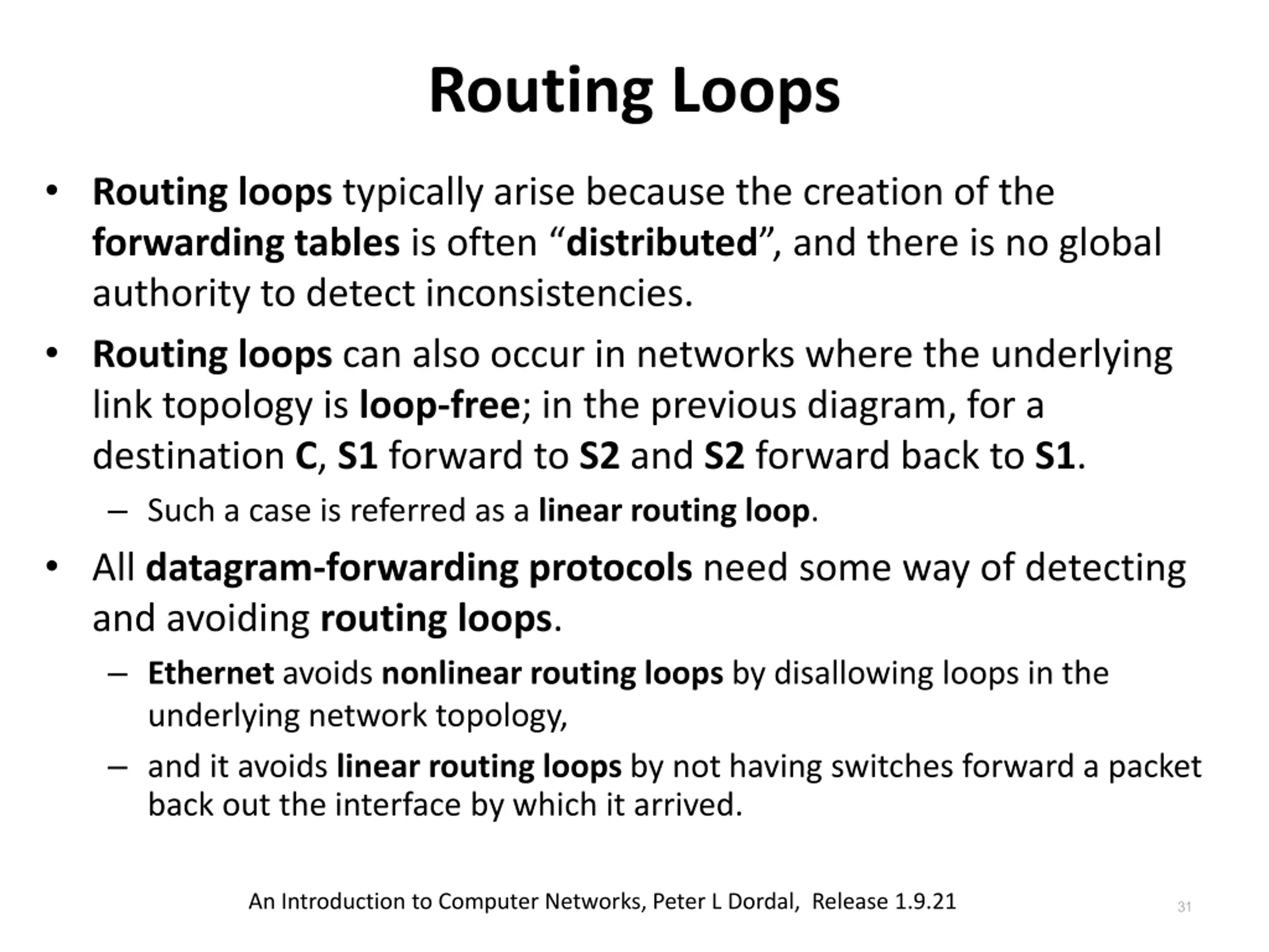 Routing Loops Routing loops typically arise because the creation of the forwarding tables is often distributed , and there is no global authority to detect inconsistencies. Routing loops can also occur in networks where the underlying link topology is loop-free; in the previous diagram, for a destination C, S1 forward to S2 and S2 forward back to S1. Such a case is referred as a linear routing loop. All datagram-forwarding protocols need some way of detecting and avoiding routing loops. Ethernet avoids nonlinear routing loops by disallowing loops in the underlying network topology, and it avoids linear routing loops by not having switches forward a packet back out the interface by which it arrived. An Introduction to Computer Networks, Peter L Dordal, Release 1.9.21 31