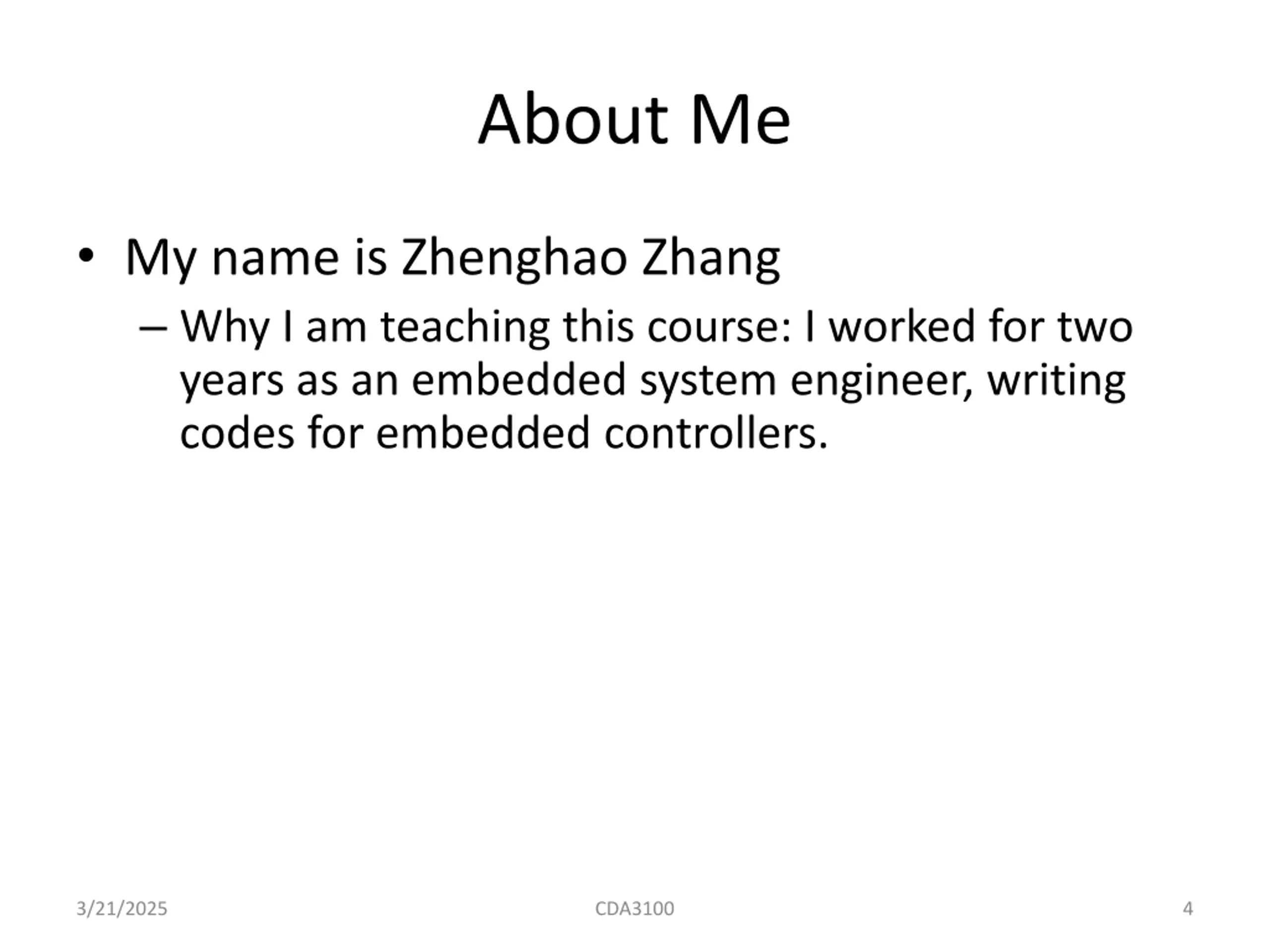 About Me My name is Zhenghao Zhang Why I am teaching this course: I worked for two years as an embedded system engineer, writing codes for embedded controllers. 3/21/2025 CDA3100 4