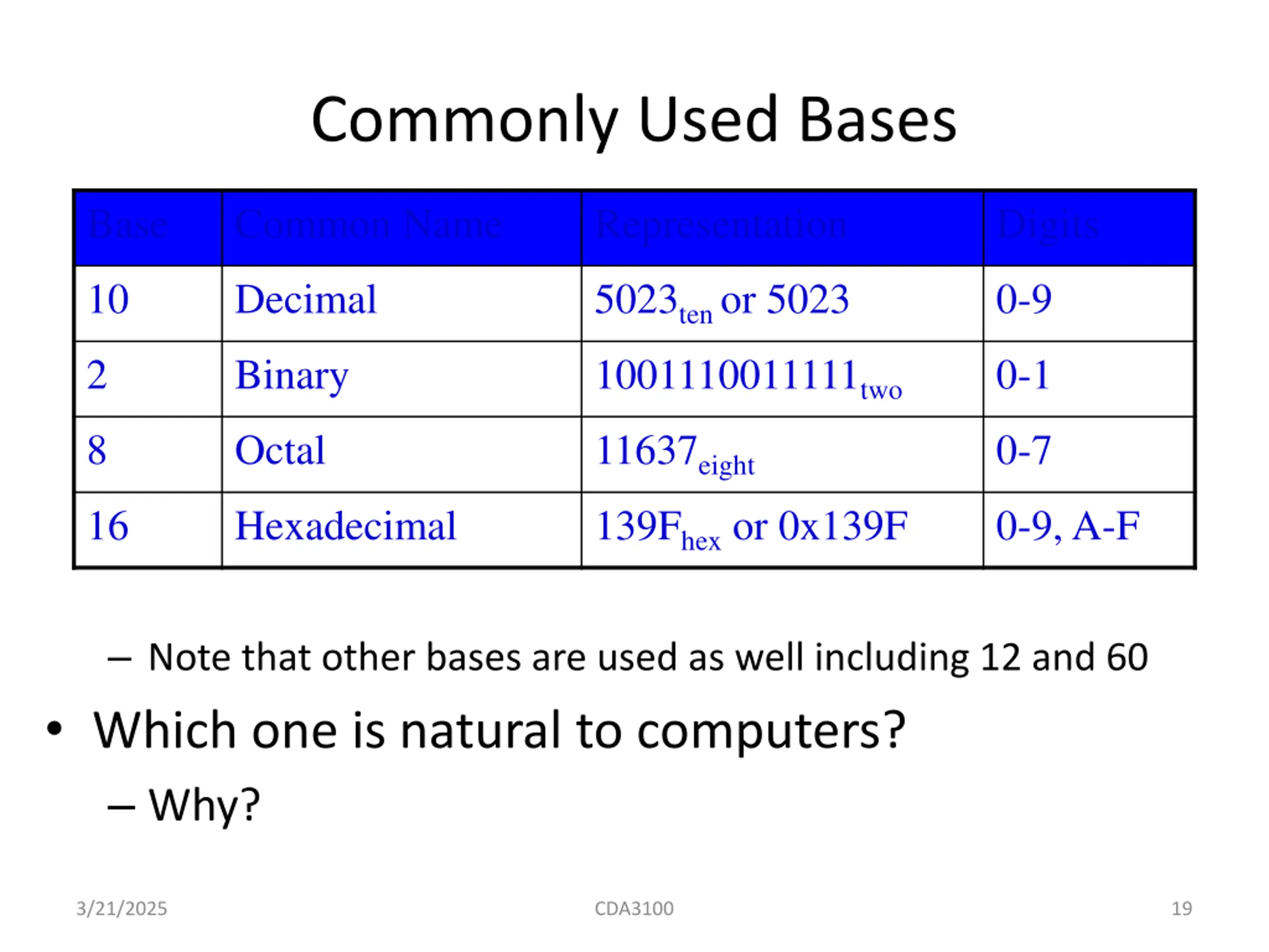 Commonly Used Bases Base Common Name Representation Digits 10 Decimal 5023ten or 5023 1001110011111two 11637eight 139Fhex or 0x139F 0-9 2 Binary 0-1 8 Octal 0-7 16 Hexadecimal 0-9, A-F Note that other bases are used as well including 12 and 60 Which one is natural to computers? Why? 3/21/2025 CDA3100 19