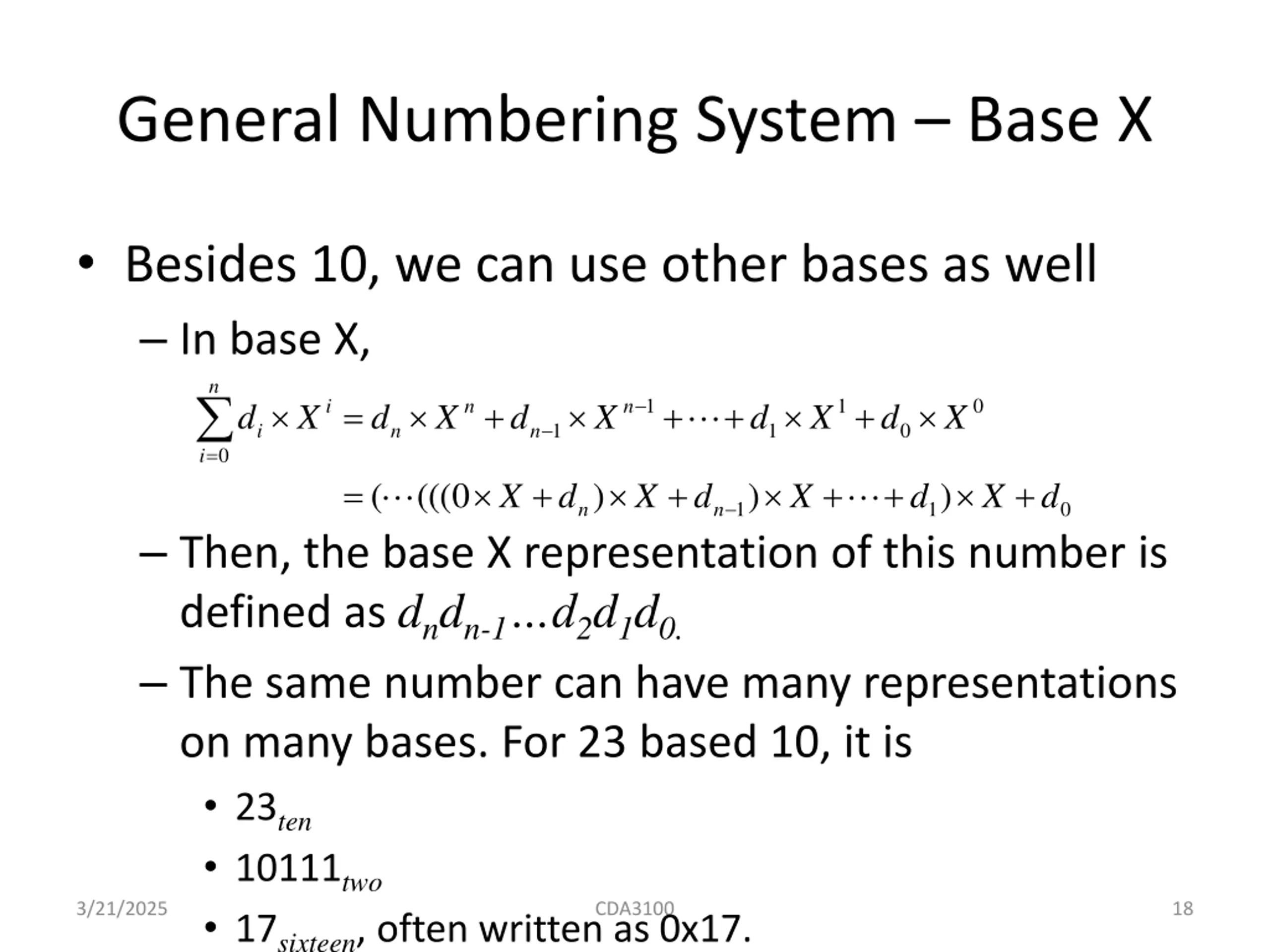 Decimal Numbering System For any nonnegative integer , its value is given by d d d d 1 1 0 n n n = = + + + + 1 1 0 i n n 10 10 10 10 10 d d d d d 1 1 0 i n n 0 i = + + + + + ( ((( 0 10 ) 10 ) 10 ) 10 d d d d 1 1 0 n n Here d0 is the least significant digit and dn is the most significant digit 3/21/2025 CDA3100 17