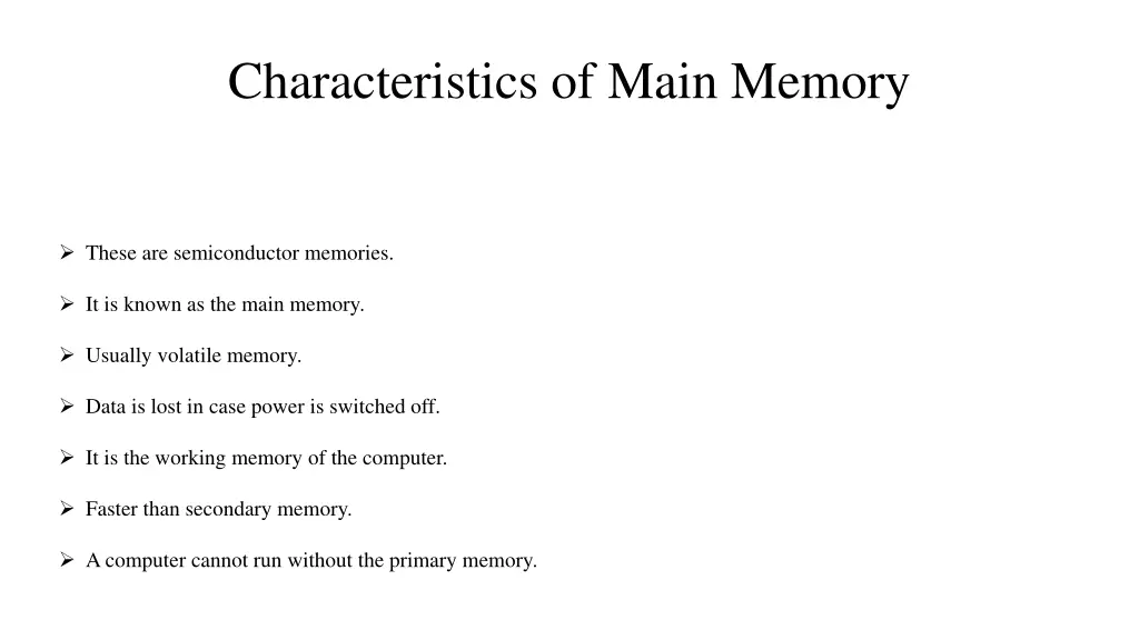 Characteristics of Main Memory These are semiconductor memories. It is known as the main memory. Usually volatile memory. Data is lost in case power is switched off. It is the working memory of the computer. Faster than secondary memory. A computer cannot run without the primary memory.