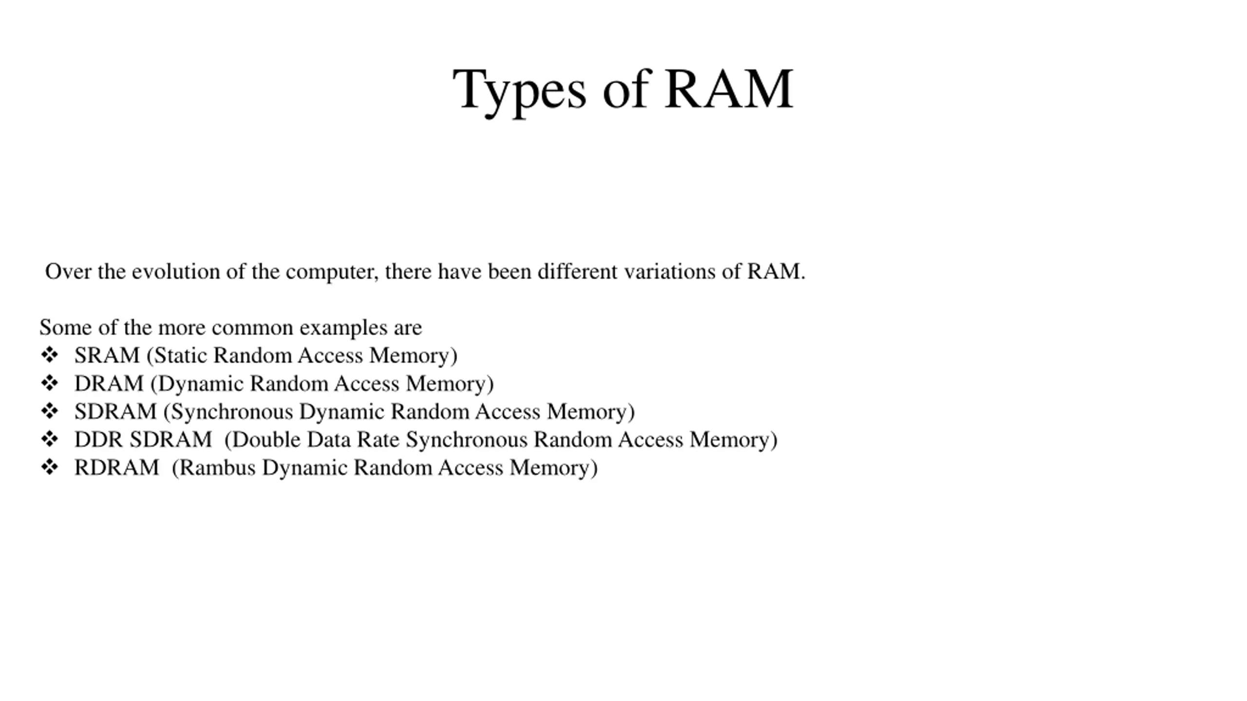Types of RAM Over the evolution of the computer, there have been different variations of RAM. Some of the more common examples are SRAM (Static Random Access Memory) DRAM (Dynamic Random Access Memory) SDRAM (Synchronous Dynamic Random Access Memory) DDR SDRAM (Double Data Rate Synchronous Random Access Memory) RDRAM (Rambus Dynamic Random Access Memory)