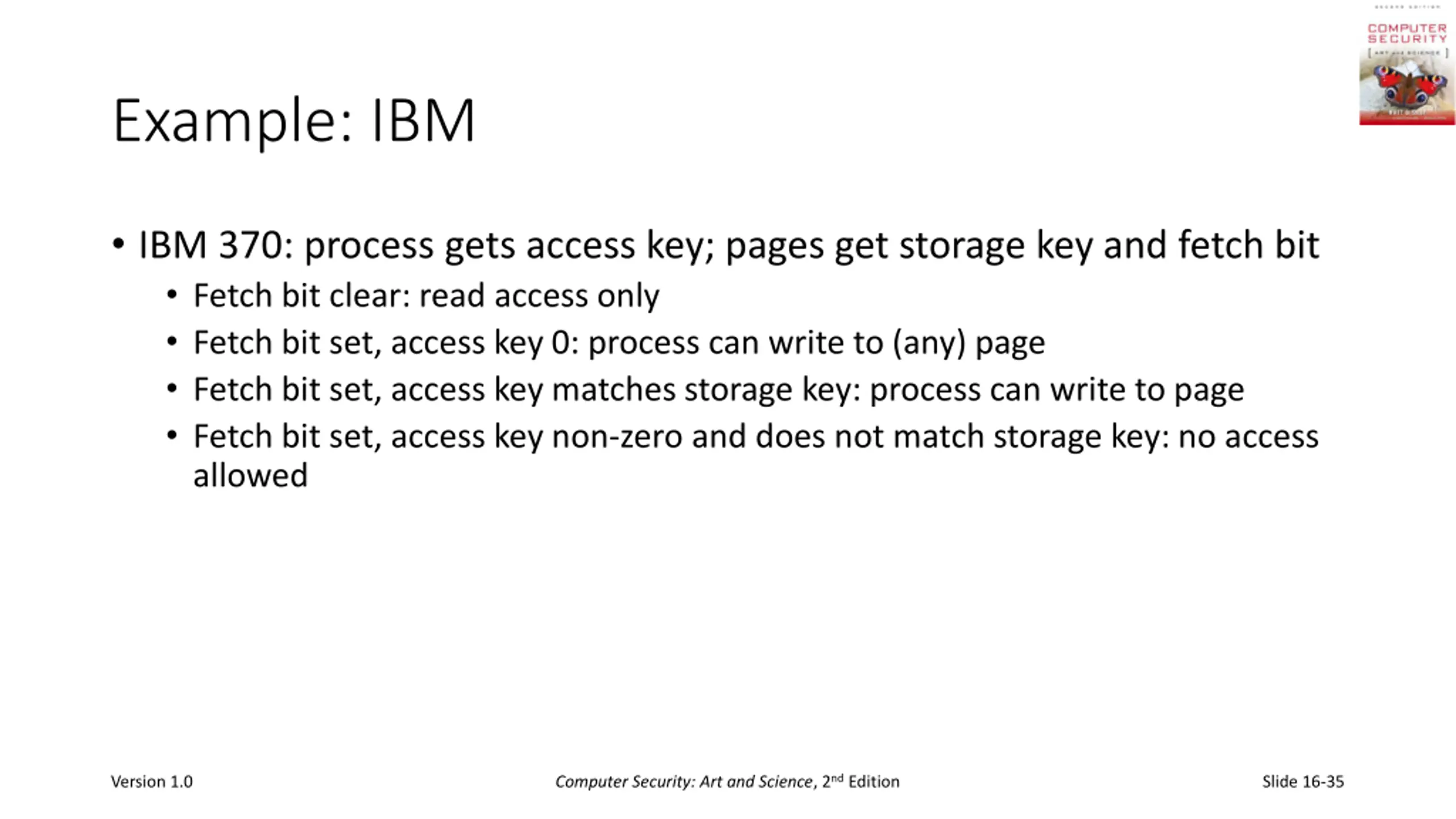 Example: IBM IBM 370: process gets access key; pages get storage key and fetch bit Fetch bit clear: read access only Fetch bit set, access key 0: process can write to (any) page Fetch bit set, access key matches storage key: process can write to page Fetch bit set, access key non-zero and does not match storage key: no access allowed Computer Security: Art and Science, 2nd Edition Version 1.0 Slide 16-35