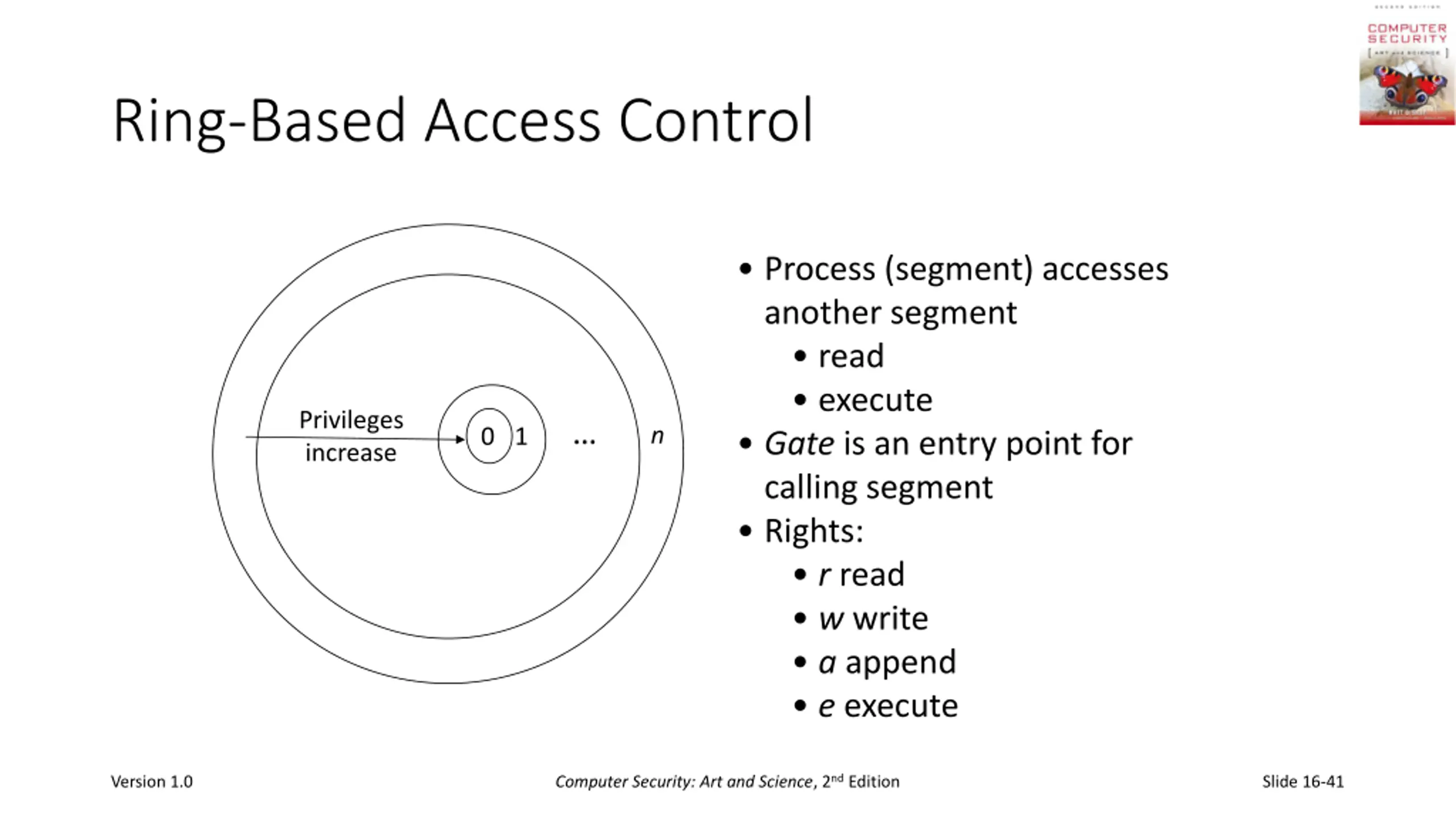 Ring-Based Access Control Process (segment) accesses another segment read execute Gate is an entry point for calling segment Rights: r read w write a append e execute Privileges increase n 0 1 Computer Security: Art and Science, 2nd Edition Version 1.0 Slide 16-41