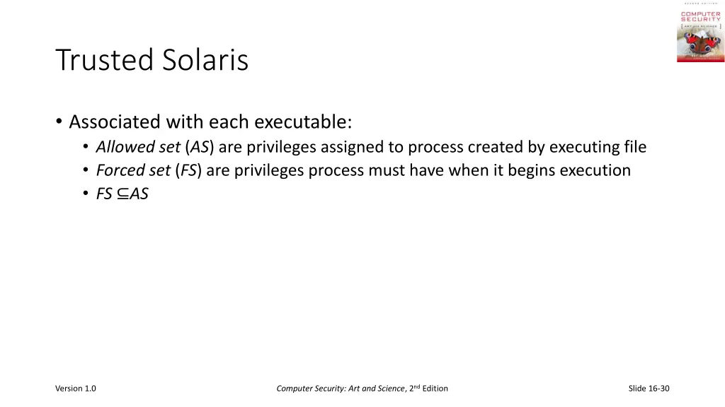 Trusted Solaris Associated with each executable: Allowed set (AS) are privileges assigned to process created by executing file Forced set (FS) are privileges process must have when it begins execution FS AS Computer Security: Art and Science, 2nd Edition Version 1.0 Slide 16-30