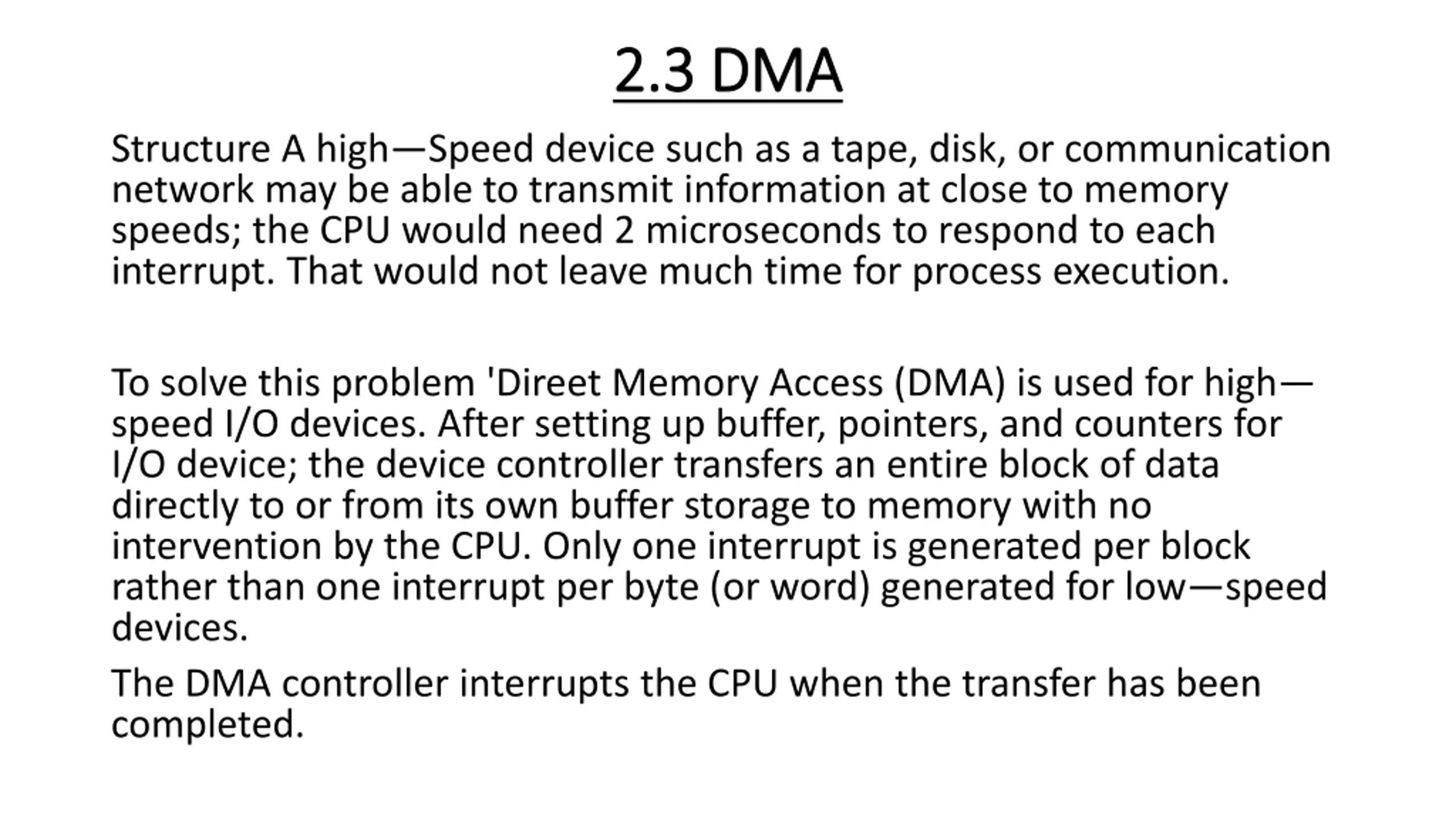2.3 2.3 DMA DMA Structure A high Speed device such as a tape, disk, or communication network may be able to transmit information at close to memory speeds; the CPU would need 2 microseconds to respond to each interrupt. That would not leave much time for process execution. To solve this problem 'Direet Memory Access (DMA) is used for high speed I/O devices. After setting up buffer, pointers, and counters for I/O device; the device controller transfers an entire block of data directly to or from its own buffer storage to memory with no intervention by the CPU. Only one interrupt is generated per block rather than one interrupt per byte (or word) generated for low speed devices. The DMA controller interrupts the CPU when the transfer has been completed.