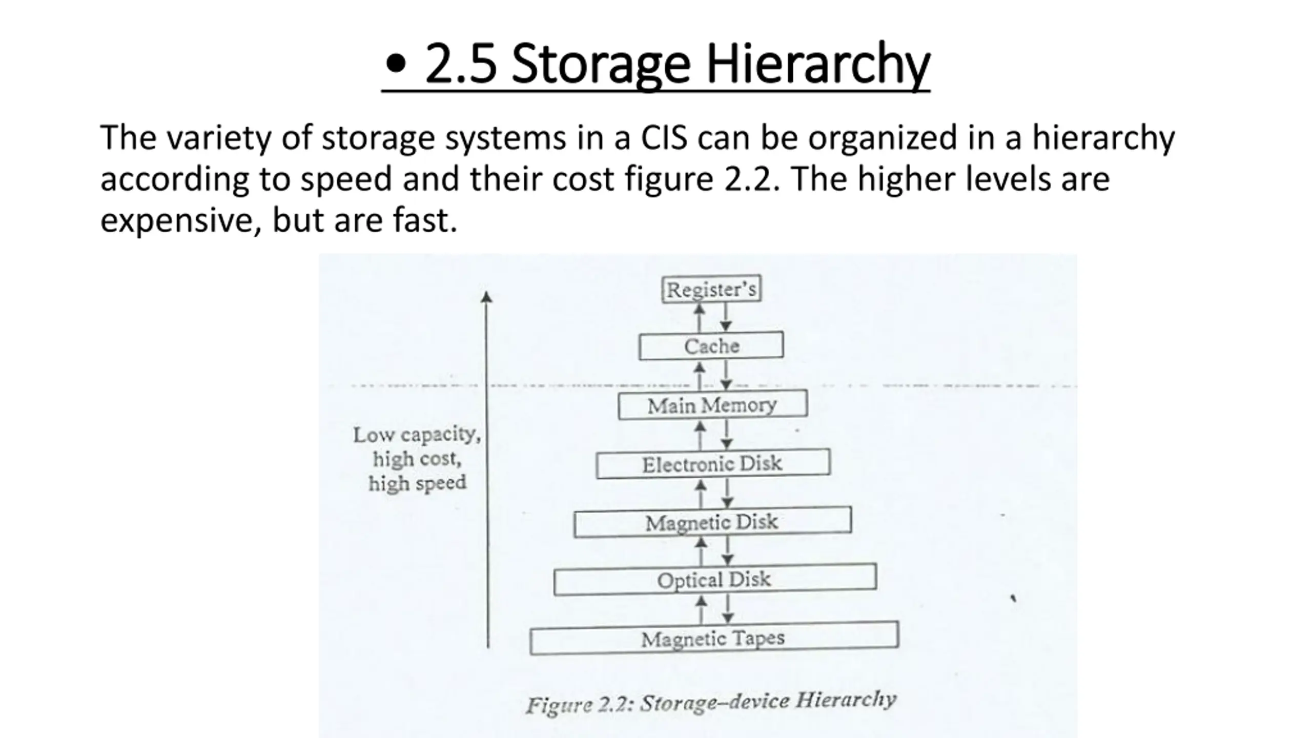 2.5 2.5 Storage Storage Hierarchy Hierarchy The variety of storage systems in a CIS can be organized in a hierarchy according to speed and their cost figure 2.2. The higher levels are expensive, but are fast.