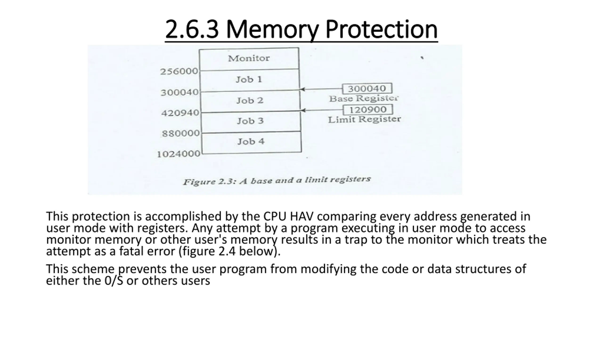 2.6.3 2.6.3 Memory Protection Memory Protection This protection is accomplished by the CPU HAV comparing every address generated in user mode with registers. Any attempt by a program executing in user mode to access monitor memory or other user's memory results in a trap to the monitor which treats the attempt as a fatal error (figure 2.4 below). This scheme prevents the user program from modifying the code or data structures of either the 0/S or others users