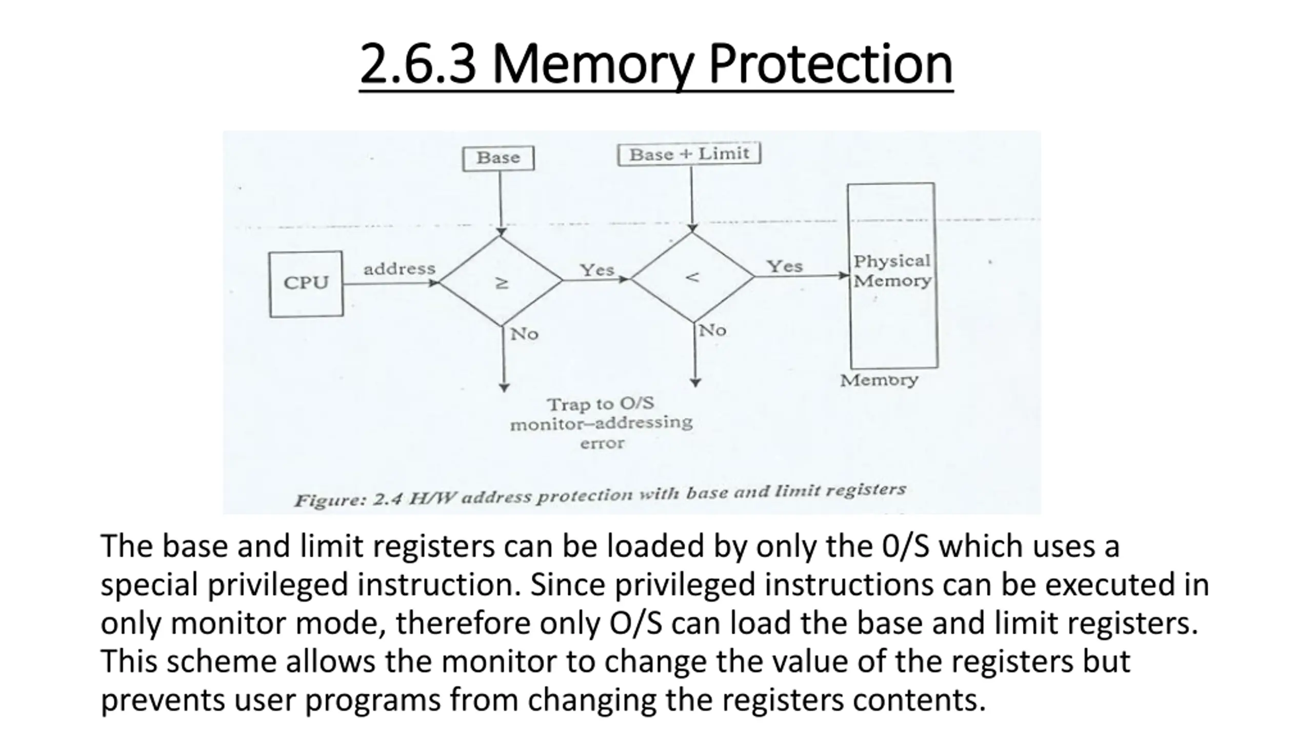 2.6.3 2.6.3 Memory Protection Memory Protection The base and limit registers can be loaded by only the 0/S which uses a special privileged instruction. Since privileged instructions can be executed in only monitor mode, therefore only O/S can load the base and limit registers. This scheme allows the monitor to change the value of the registers but prevents user programs from changing the registers contents.