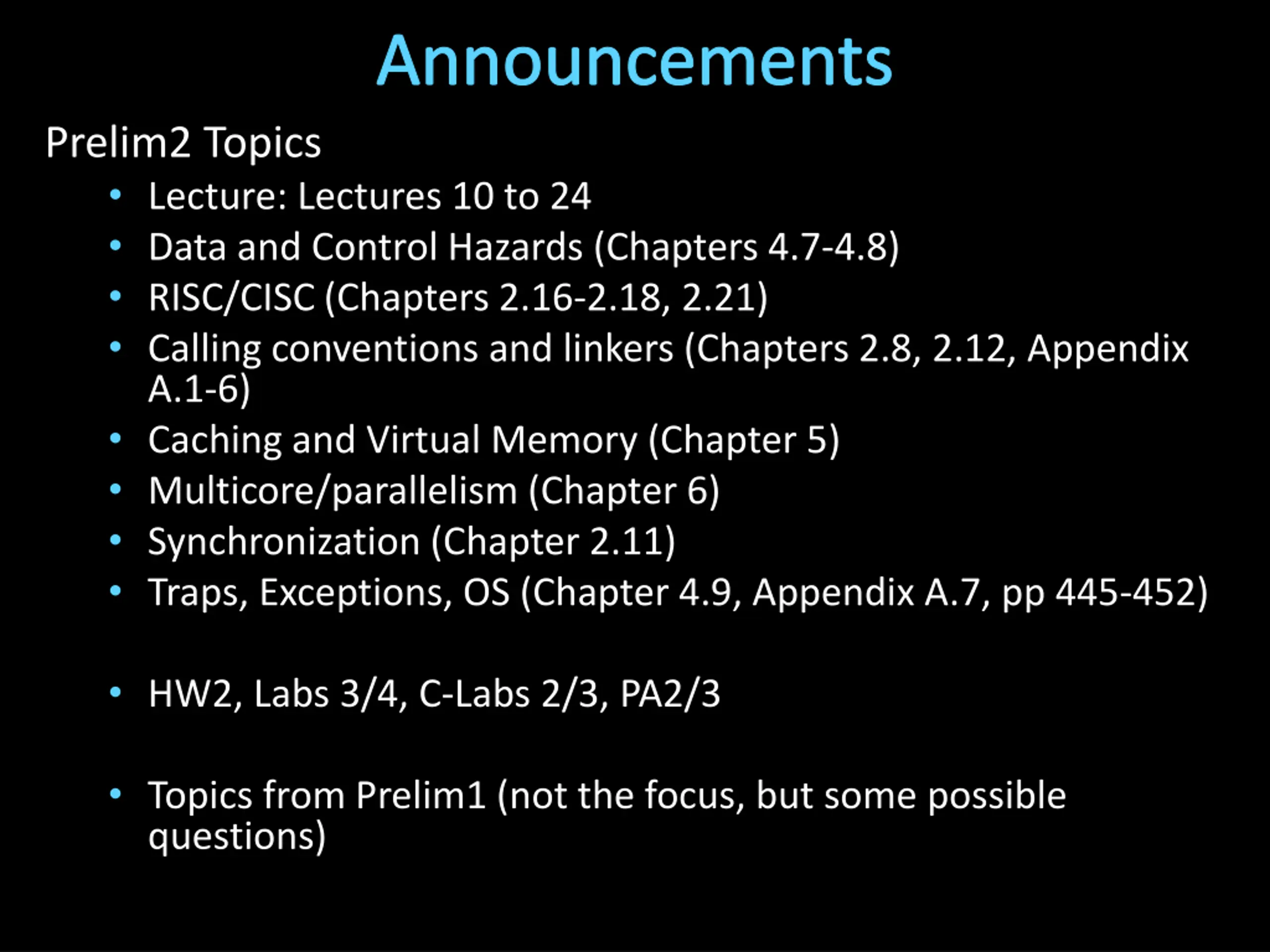 Announcements Prelim2 Topics Lecture: Lectures 10 to 24 Data and Control Hazards (Chapters 4.7-4.8) RISC/CISC (Chapters 2.16-2.18, 2.21) Calling conventions and linkers (Chapters 2.8, 2.12, Appendix A.1-6) Caching and Virtual Memory (Chapter 5) Multicore/parallelism (Chapter 6) Synchronization (Chapter 2.11) Traps, Exceptions, OS (Chapter 4.9, Appendix A.7, pp 445-452) HW2, Labs 3/4, C-Labs 2/3, PA2/3 Topics from Prelim1 (not the focus, but some possible questions)