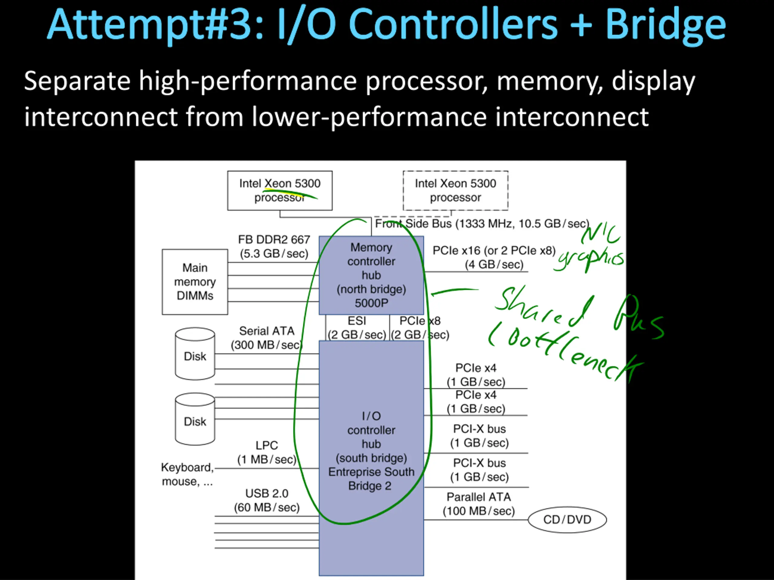 Attempt#3: I/O Controllers + Bridge Separate high-performance processor, memory, display interconnect from lower-performance interconnect