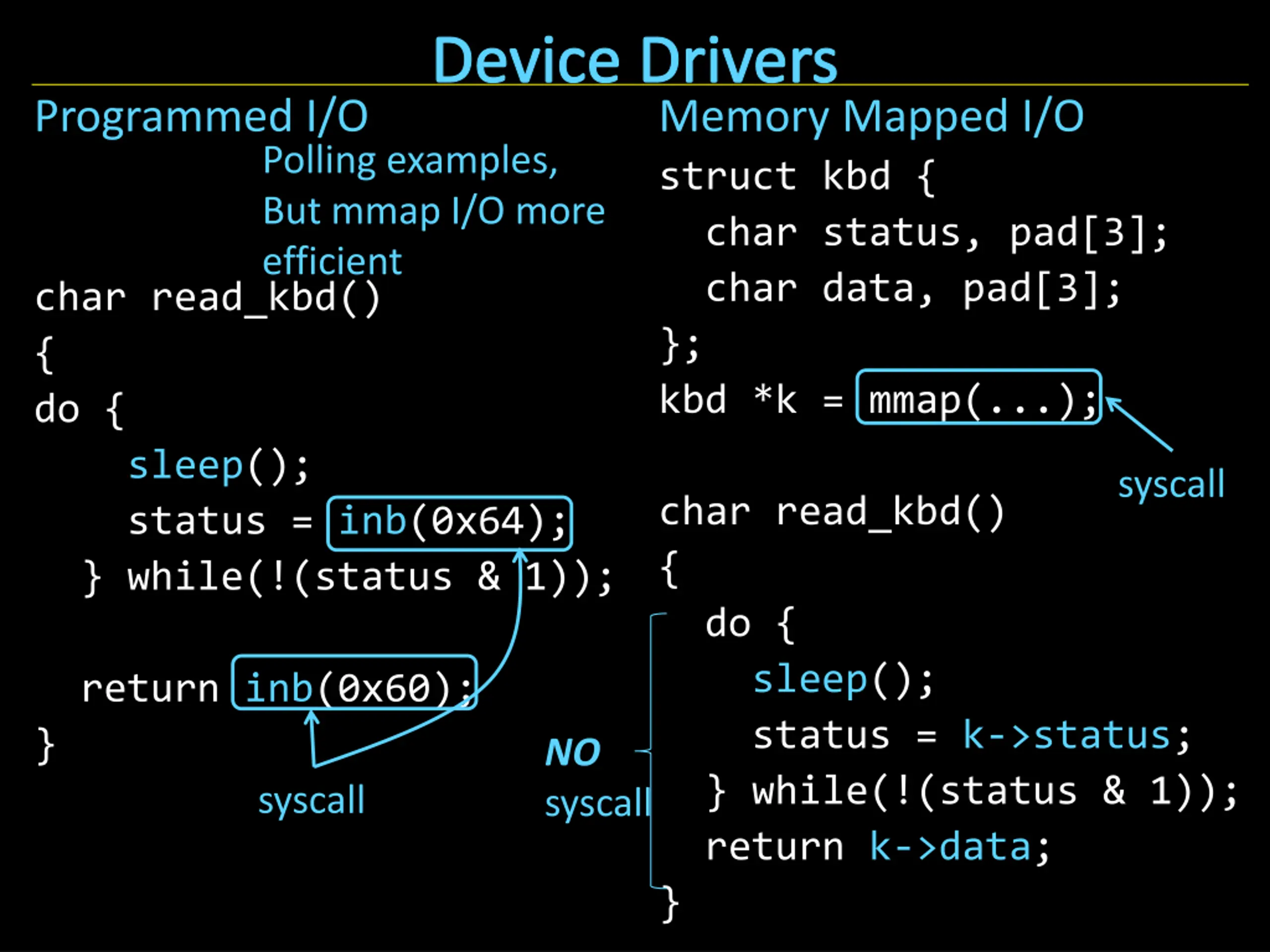 Device Drivers Programmed I/O Memory Mapped I/O struct kbd { char status, pad[3]; char data, pad[3]; }; kbd *k = mmap(...); Polling examples, But mmap I/O more efficient char read_kbd() { do { sleep(); status = inb(0x64); } while(!(status & 1)); syscall char read_kbd() { do { sleep(); status = k->status; } while(!(status & 1)); return k->data; } return inb(0x60); } NO syscall syscall