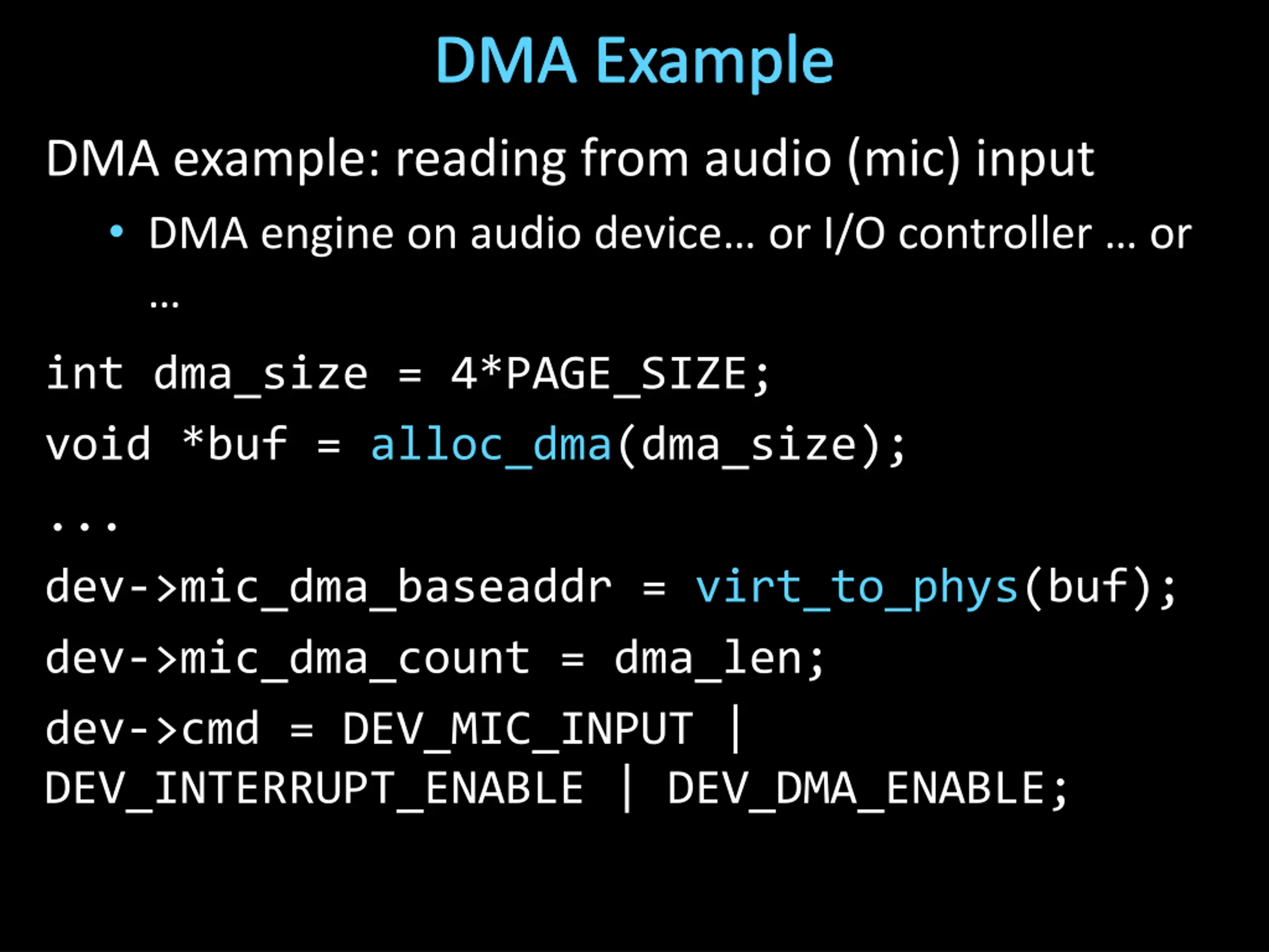 DMA Example DMA example: reading from audio (mic) input DMA engine on audio device or I/O controller or int dma_size = 4*PAGE_SIZE; void *buf = alloc_dma(dma_size); ... dev->mic_dma_baseaddr = virt_to_phys(buf); dev->mic_dma_count = dma_len; dev->cmd = DEV_MIC_INPUT | DEV_INTERRUPT_ENABLE | DEV_DMA_ENABLE;