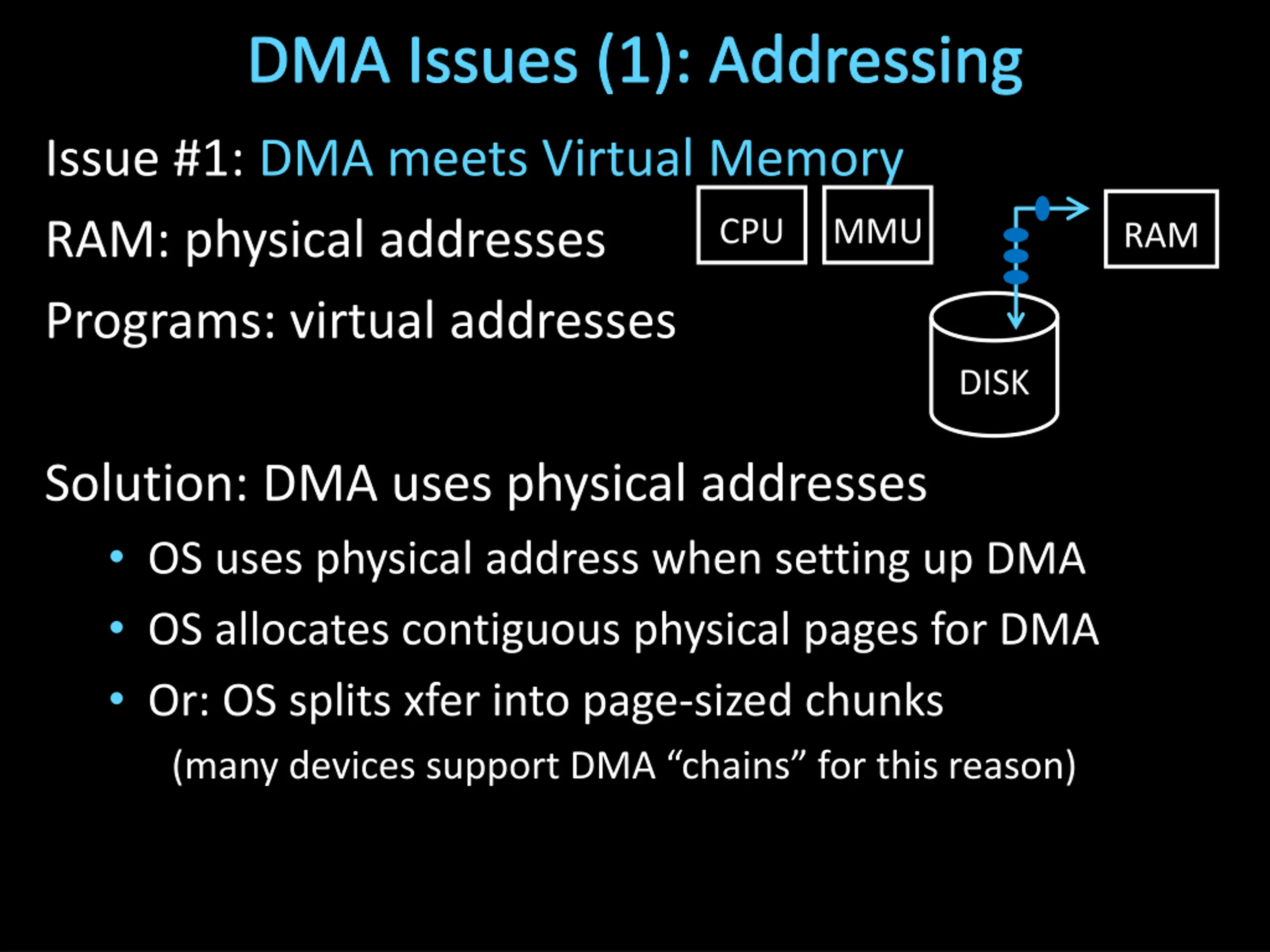 DMA Issues (1): Addressing Issue #1: DMA meets Virtual Memory RAM: physical addresses Programs: virtual addresses CPU MMU RAM DISK Solution: DMA uses physical addresses OS uses physical address when setting up DMA OS allocates contiguous physical pages for DMA Or: OS splits xfer into page-sized chunks (many devices support DMA chains for this reason)