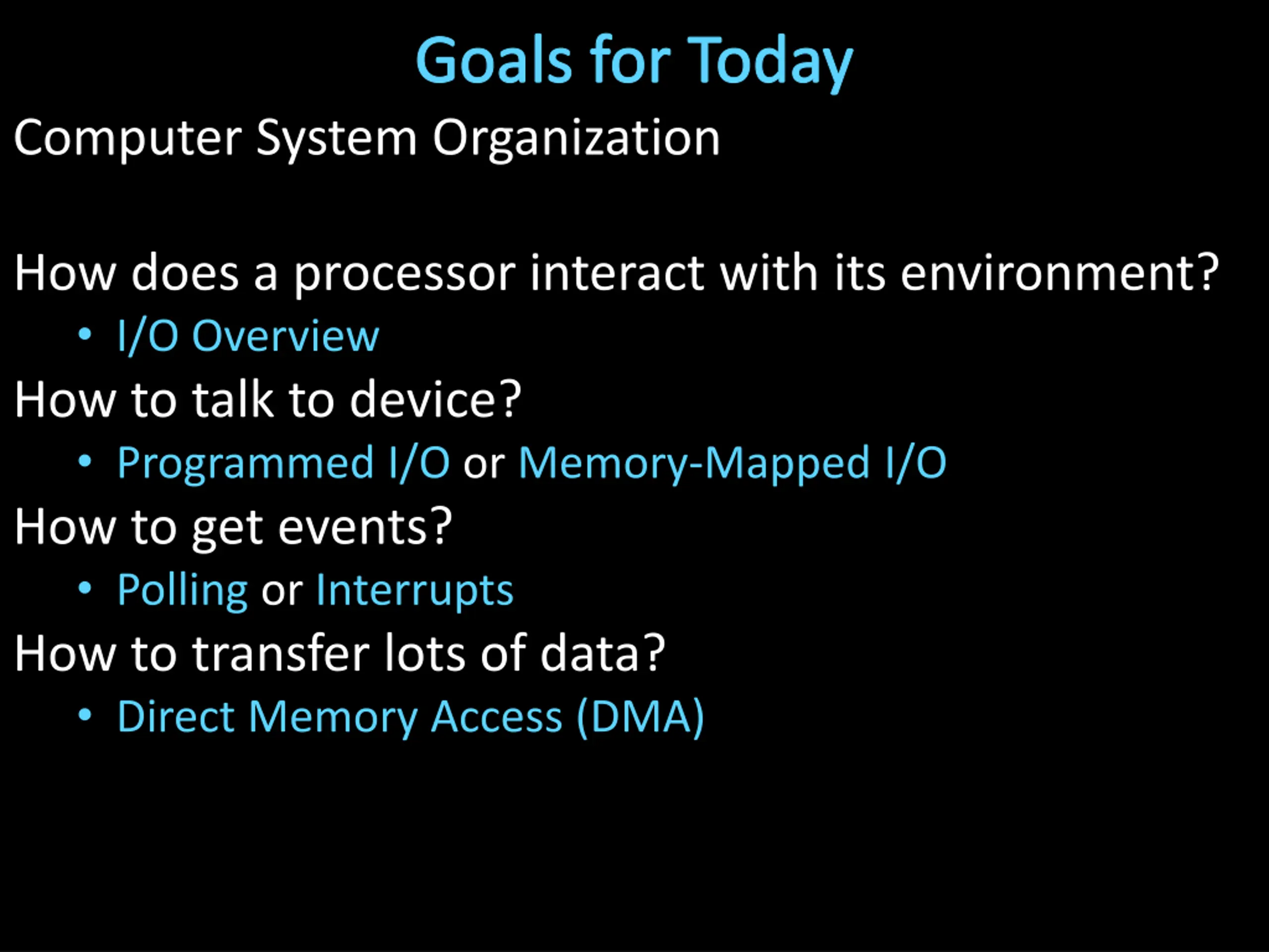 Goals for Today Computer System Organization How does a processor interact with its environment? I/O Overview How to talk to device? Programmed I/O or Memory-Mapped I/O How to get events? Polling or Interrupts How to transfer lots of data? Direct Memory Access (DMA)