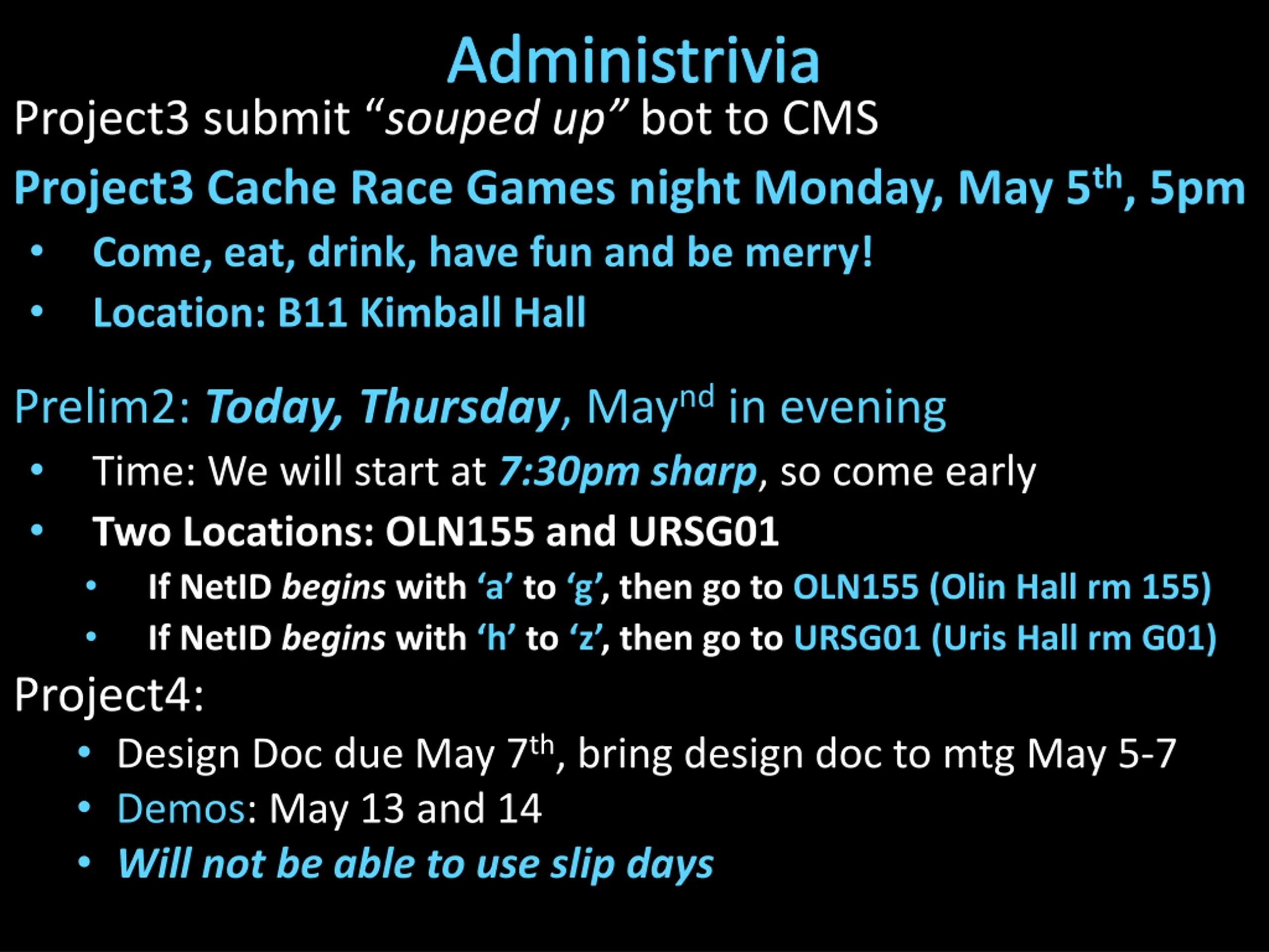 Administrivia Project3 submit souped up bot to CMS Project3 Cache Race Games night Monday, May 5th, 5pm Come, eat, drink, have fun and be merry! Location: B11 Kimball Hall Prelim2: Today, Thursday, Maynd in evening Time: We will start at 7:30pm sharp, so come early Two Locations: OLN155 and URSG01 If NetID begins with a to g , then go to OLN155 (Olin Hall rm 155) If NetID begins with h to z , then go to URSG01 (Uris Hall rm G01) Project4: Design Doc due May 7th, bring design doc to mtg May 5-7 Demos: May 13 and 14 Will not be able to use slip days