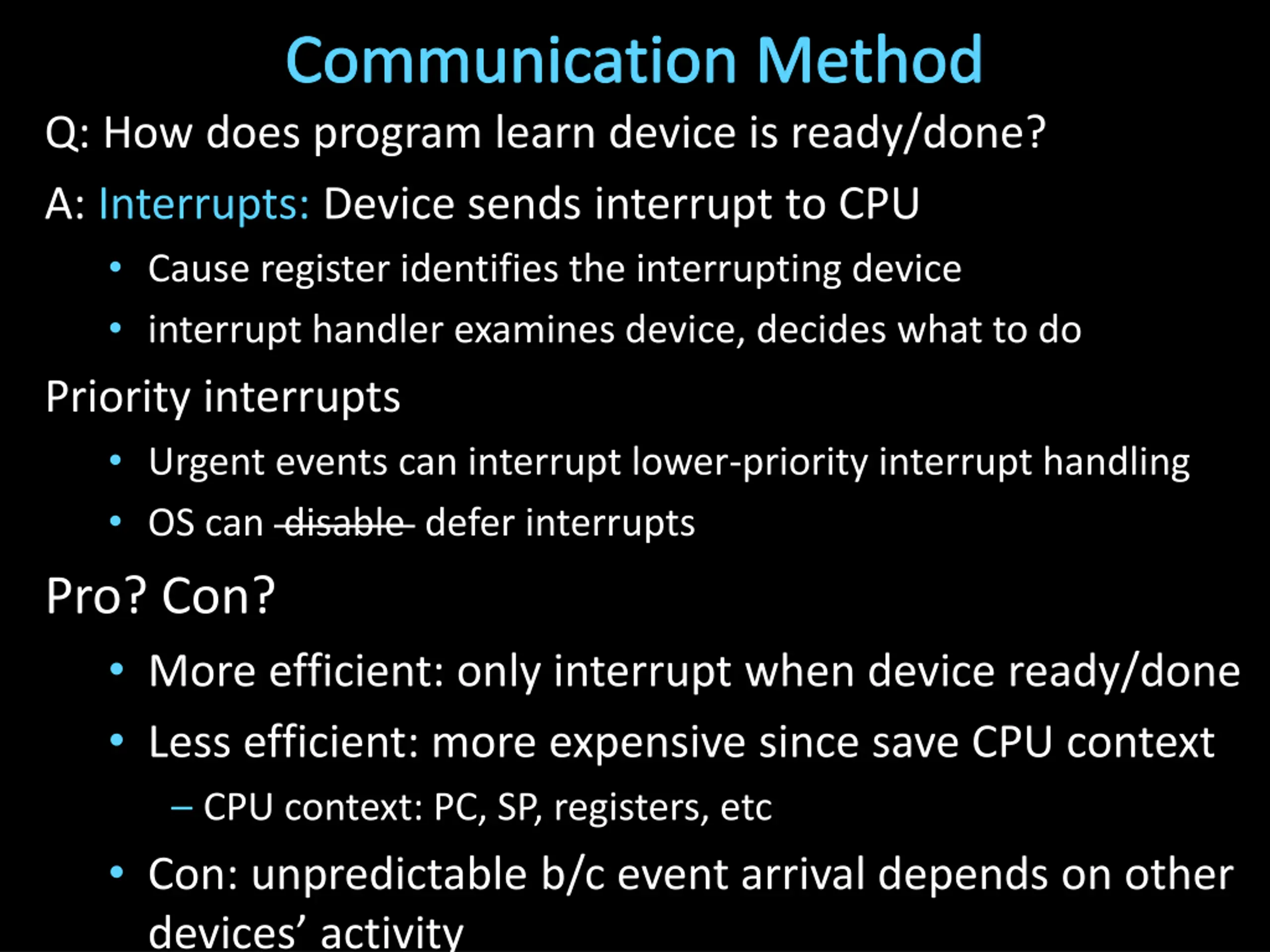 Communication Method Q: How does program learn device is ready/done? A: Interrupts: Device sends interrupt to CPU Cause register identifies the interrupting device interrupt handler examines device, decides what to do Priority interrupts Urgent events can interrupt lower-priority interrupt handling OS can disable defer interrupts Pro? Con? More efficient: only interrupt when device ready/done Less efficient: more expensive since save CPU context CPU context: PC, SP, registers, etc Con: unpredictable b/c event arrival depends on other devices activity