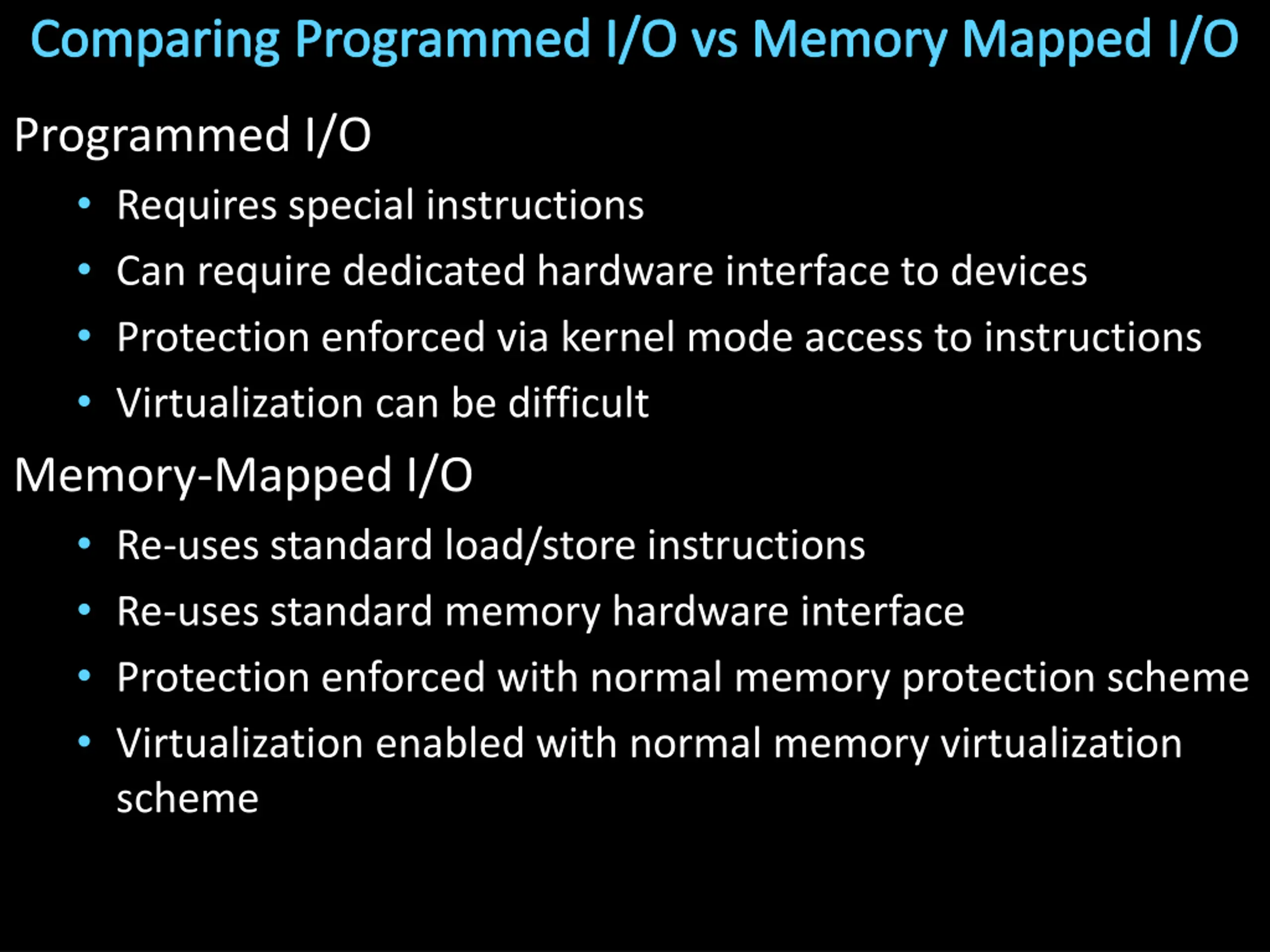 Comparing Programmed I/O vs Memory Mapped I/O Programmed I/O Requires special instructions Can require dedicated hardware interface to devices Protection enforced via kernel mode access to instructions Virtualization can be difficult Memory-Mapped I/O Re-uses standard load/store instructions Re-uses standard memory hardware interface Protection enforced with normal memory protection scheme Virtualization enabled with normal memory virtualization scheme