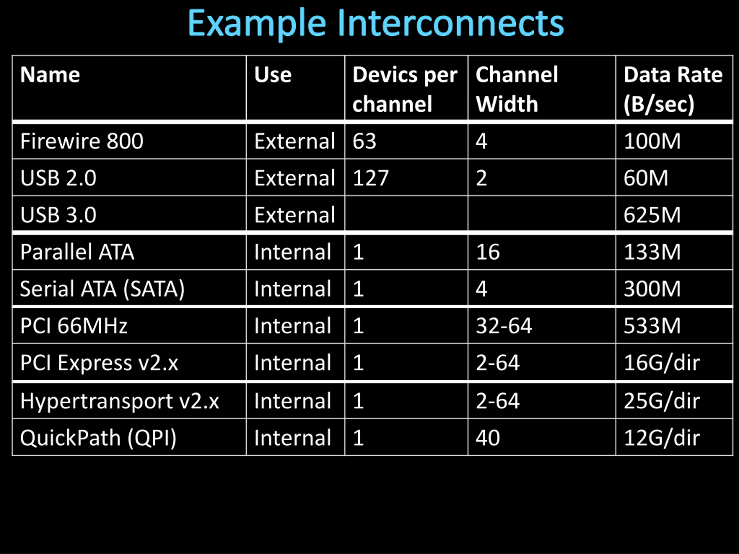 Example Interconnects Name Use Devics per channel Channel Width Data Rate (B/sec) Firewire 800 External 63 4 100M USB 2.0 External 127 2 60M USB 3.0 External 625M Parallel ATA Serial ATA (SATA) Internal 1 Internal 1 16 4 133M 300M PCI 66MHz Internal 1 32-64 533M PCI Express v2.x Internal 1 2-64 16G/dir Hypertransport v2.x Internal 1 2-64 25G/dir QuickPath (QPI) Internal 1 40 12G/dir