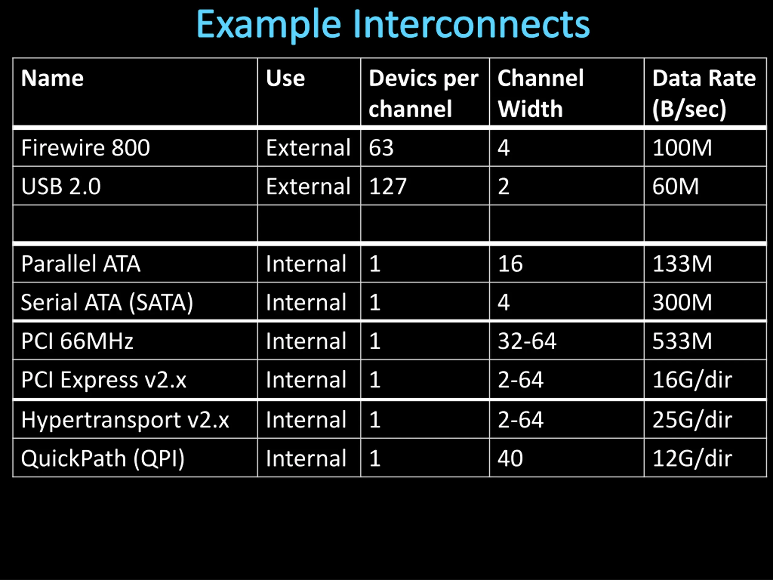 Example Interconnects Name Use Devics per channel Channel Width Data Rate (B/sec) Firewire 800 External 63 4 100M USB 2.0 External 127 2 60M Parallel ATA Serial ATA (SATA) Internal 1 Internal 1 16 4 133M 300M PCI 66MHz Internal 1 32-64 533M PCI Express v2.x Internal 1 2-64 16G/dir Hypertransport v2.x Internal 1 2-64 25G/dir QuickPath (QPI) Internal 1 40 12G/dir
