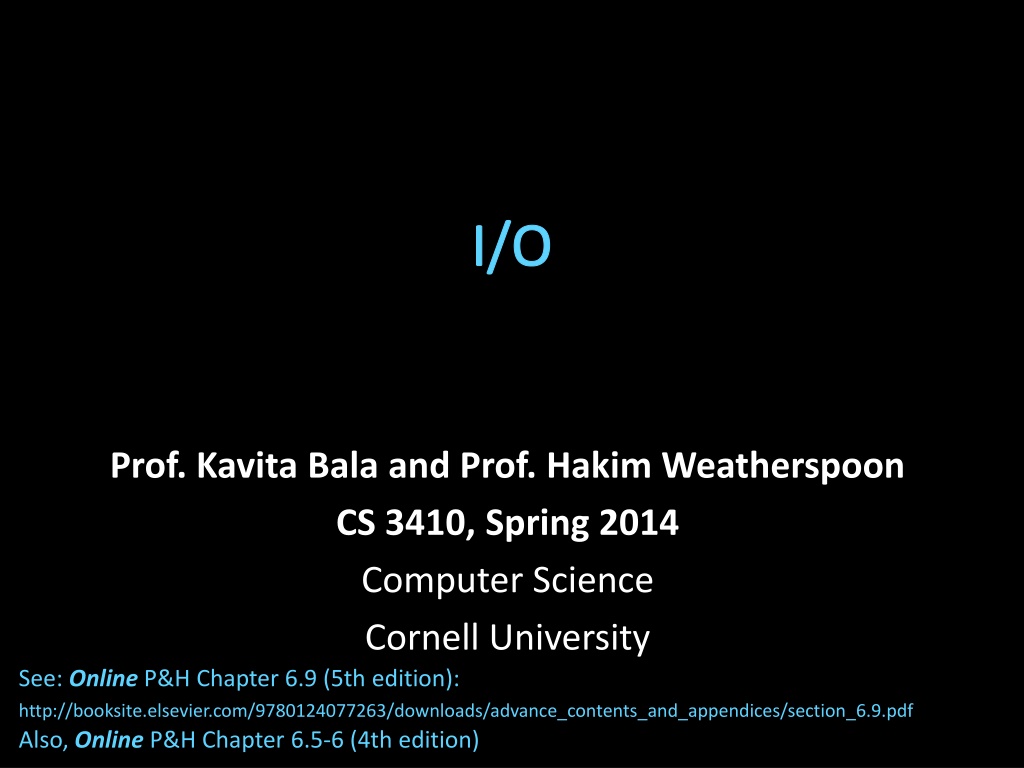I/O Prof. Kavita Bala and Prof. Hakim Weatherspoon CS 3410, Spring 2014 Computer Science Cornell University See: Online P&H Chapter 6.9 (5th edition): http://booksite.elsevier.com/9780124077263/downloads/advance_contents_and_appendices/section_6.9.pdf Also, Online P&H Chapter 6.5-6 (4th edition)