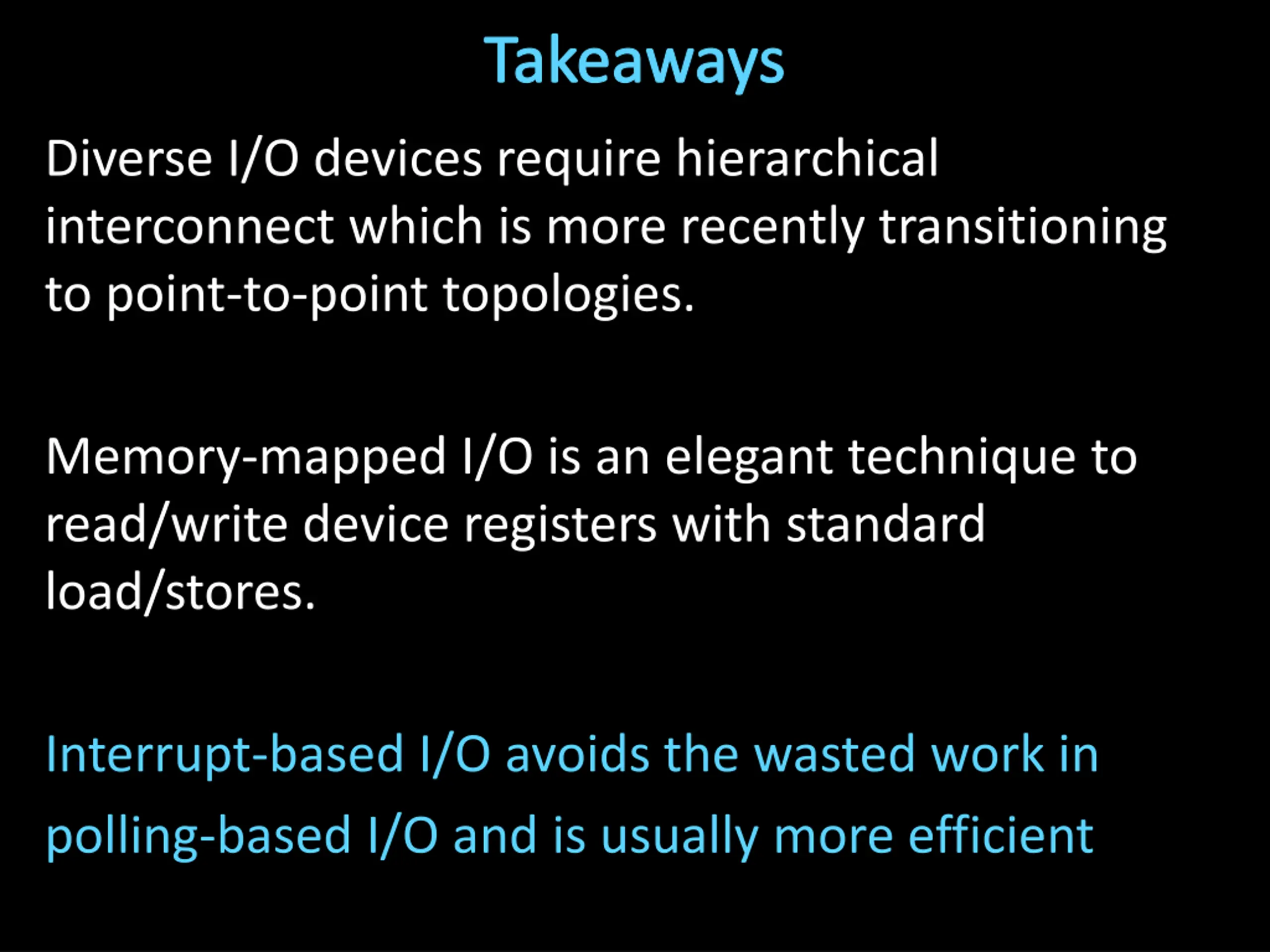 Takeaways Diverse I/O devices require hierarchical interconnect which is more recently transitioning to point-to-point topologies. Memory-mapped I/O is an elegant technique to read/write device registers with standard load/stores. Interrupt-based I/O avoids the wasted work in polling-based I/O and is usually more efficient