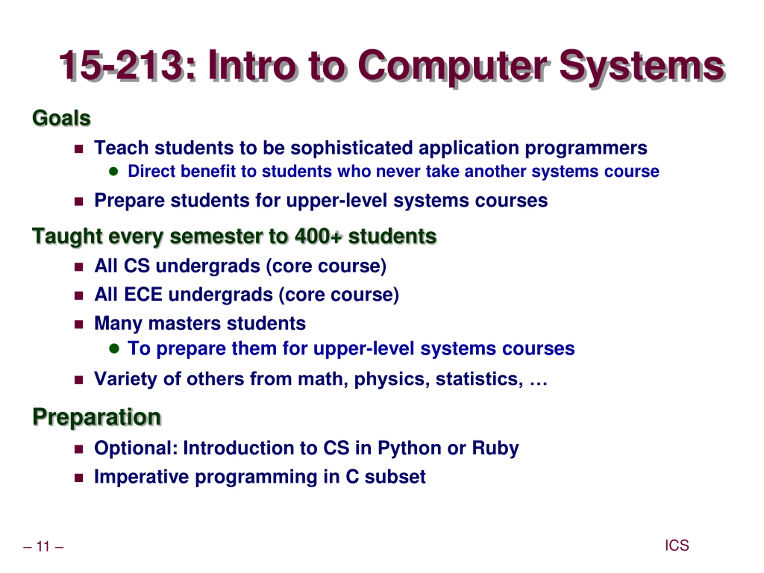 Birth of ICS 1997: REB/DROH pursue new idea: Introduce them to computer systems from a programmer's perspective rather than a system designer's perspective. Topic Filter: What parts of a computer system affect the correctness, performance, and utility of my C programs? 1998: Replace architecture course with new course: 15-213: Introduction to Computer Systems Curriculum Changes Sophomore level course Eliminated digital design & architecture as required courses for CS majors ICS 10